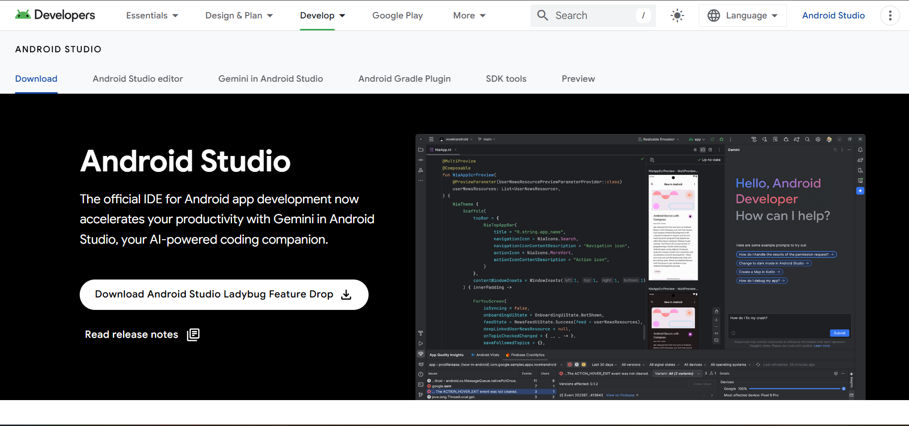 Android Studio includes AI features, mainly through Gemini, an AI-powered coding tool. Gemini helps with code generation, debugging, UI design, and development tasks. Android Studio also helps users build AI features into their apps, such as On-device AI (Gemini Nano) and Cloud AI (Gemini Pro/Flash & Imagen).