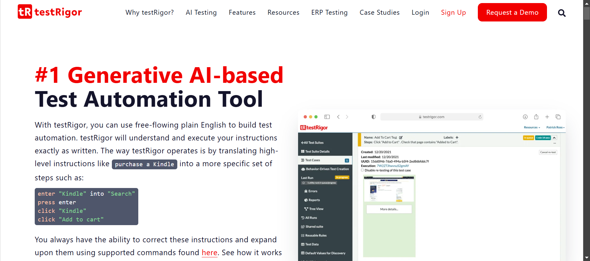 - Easy test creation for everyone: Writing tests and interacting with UI elements through test cases is straightforward, thanks to testRigor’s use of generative AI. Use plain English commands, making it ideal for everyone to understand and collaborate on. Moreover, there is no need to find implementation details of complex UI elements visible on the screen because testRigor does not ask you to mention XPaths or CSS tags. All you need to do is mention how the element appears to you on the screen and leave it to testRigor to use Vision AI, NLP, AI Context to find what you are looking for. Read: All-Inclusive Guide to Test Case Creation in testRigor.