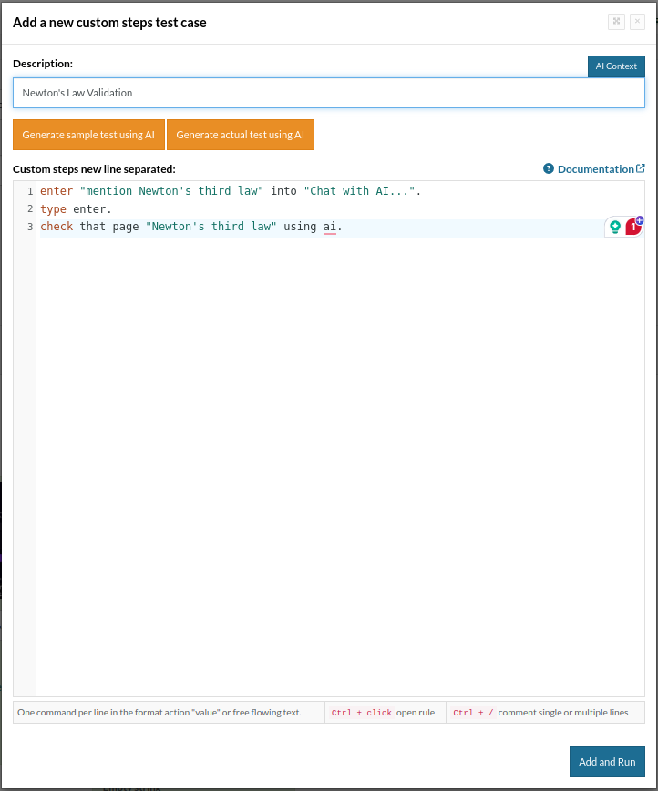 enter "mention Newton's third law" into "Chat with AI...". type enter. check that page "contains Newton's third law" using ai.