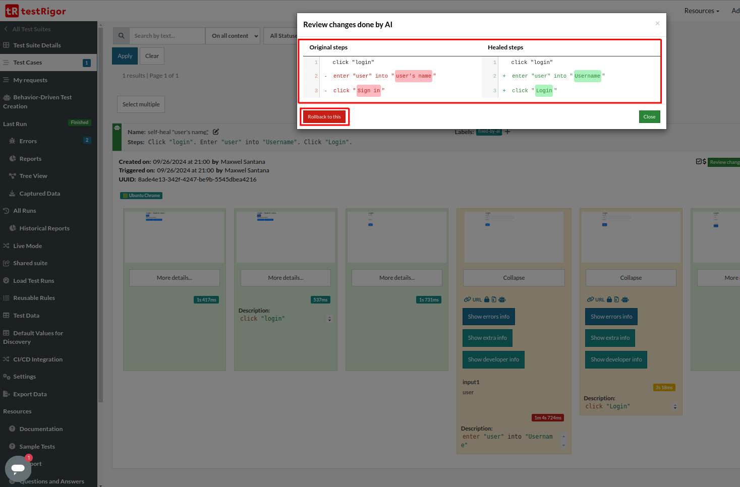 Another feature of testRigor is AI-based self-healing. testRigor tracks UI changes from many test runs to learn to adapt on their own. If the selector or position of an element changes, the tool has to fall back to historical data and make the fix accordingly. This can be seen in the testRigor reports by clicking “Show extra info” button.