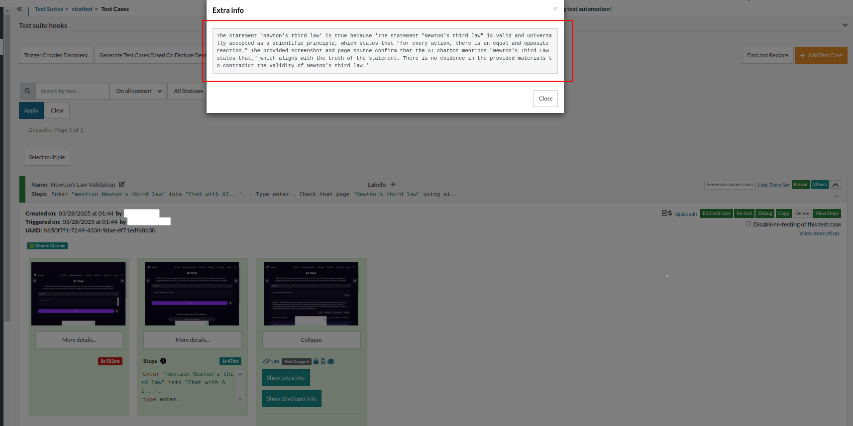 testRigor validates the chatbot response and confirms whether it is correct or not. You can review the test output by clicking the “Show extra info” button.