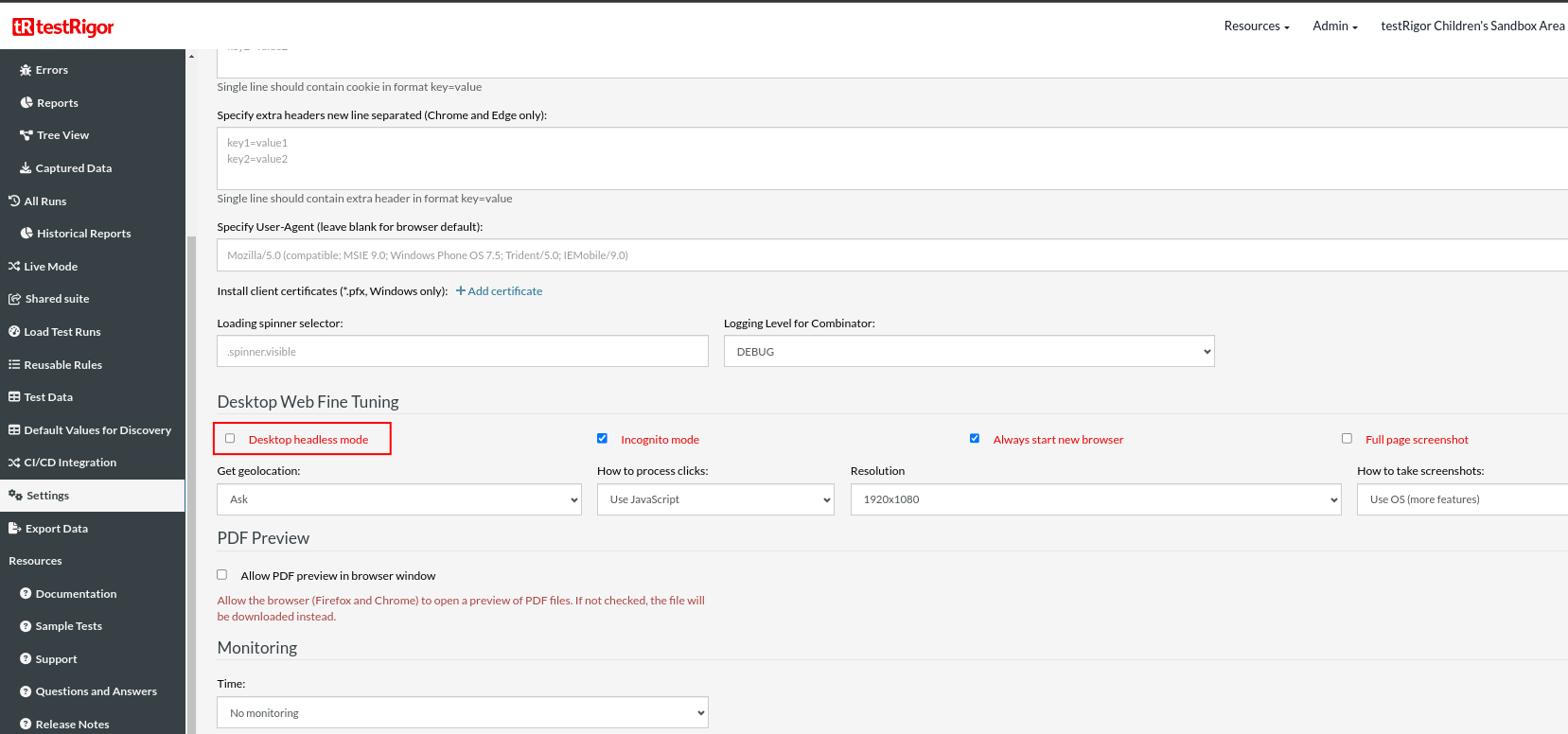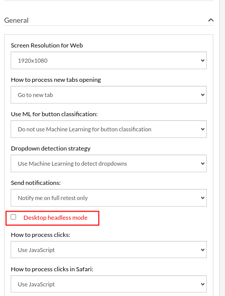 If you already have a test suite, and want to run in headless mode, then go to Settings on the left side panel and click Advanced tab, there scroll down to Desktop Web Fine Tuning. There will be a checkbox to enable Desktop headless mode. You can enable that if you need to execute in headless mode.