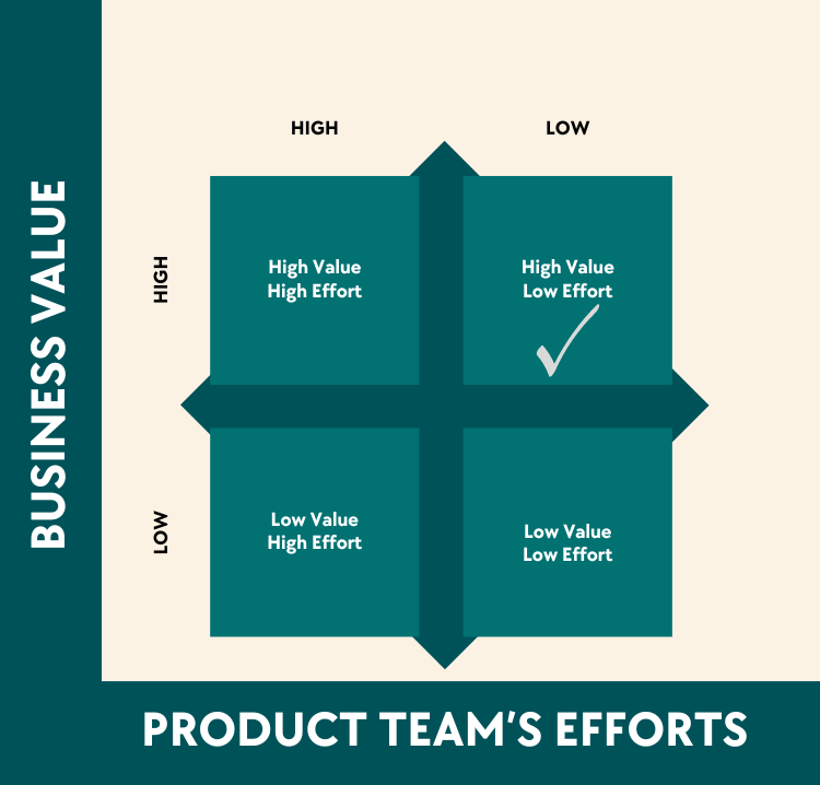 We can use the Business Value Matrix for this purpose, as shown below. We must choose tasks that require little effort and provide high value. Brainstorm about the outcomes to be achieved, the capacity of the product team, the associated business/customer value, and finally, the tasks that will lead to these outcomes.