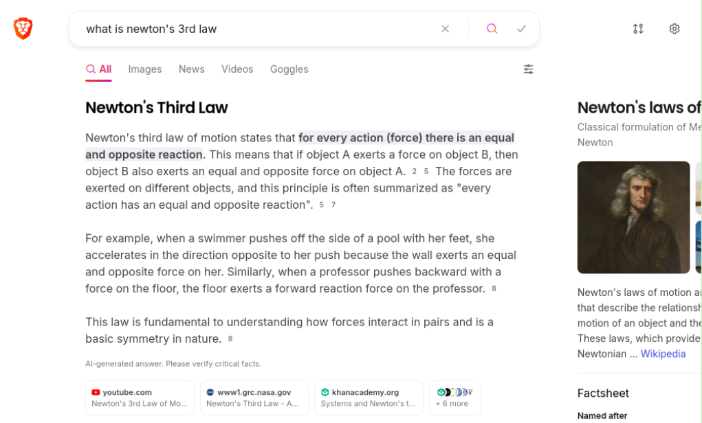 The statement ‘contains a generative AI-based summary with the explanation of the 3rd law which is for every action there is an equal and opposite reaction’ is true because ‘The screenshot shows a Brave Search results page that clearly contains an AI-generated summary about Newton’s 3rd Law, as indicated by the “AI-generated answer. Please verify critical facts” disclaimer at the bottom of the explanation. The summary explicitly explains that Newton’s third law states “for every action (forc…