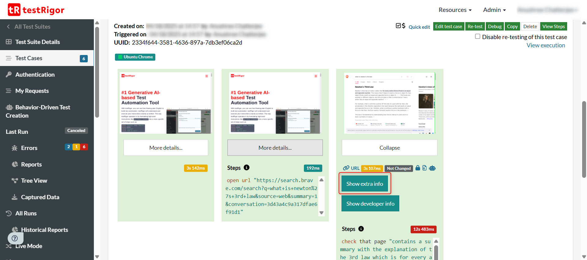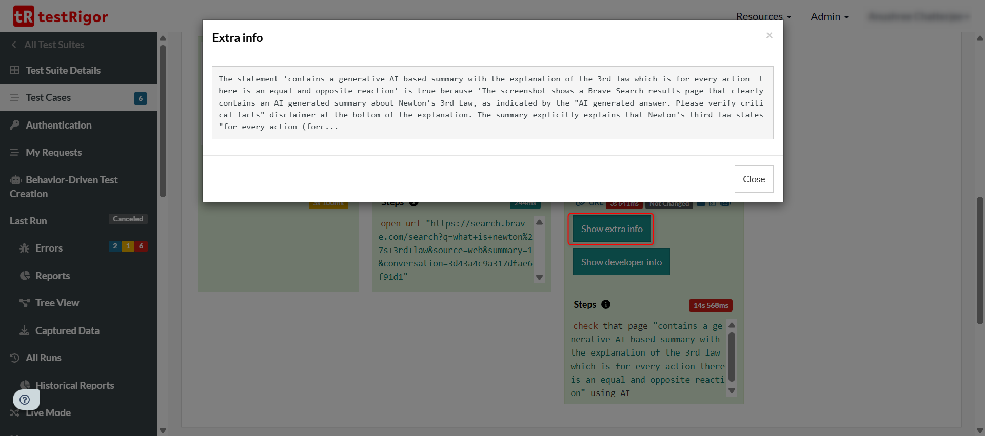 The best part is that there’s even a summary of what the AI engine found. Under the “Show extra info” section, for every step that you test with the “using ai” feature, you can see the AI engine’s explanation for passing or failing it. For example, in the above case, the explanation that testRigor provides is this: