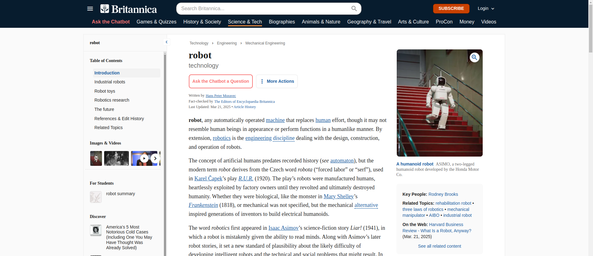 Let’s take a look at an example of how testRigor helps test images. In the example, let’s consider the image of a humanoid robot from the Britannica website. So, first let’s go with a negative validation.