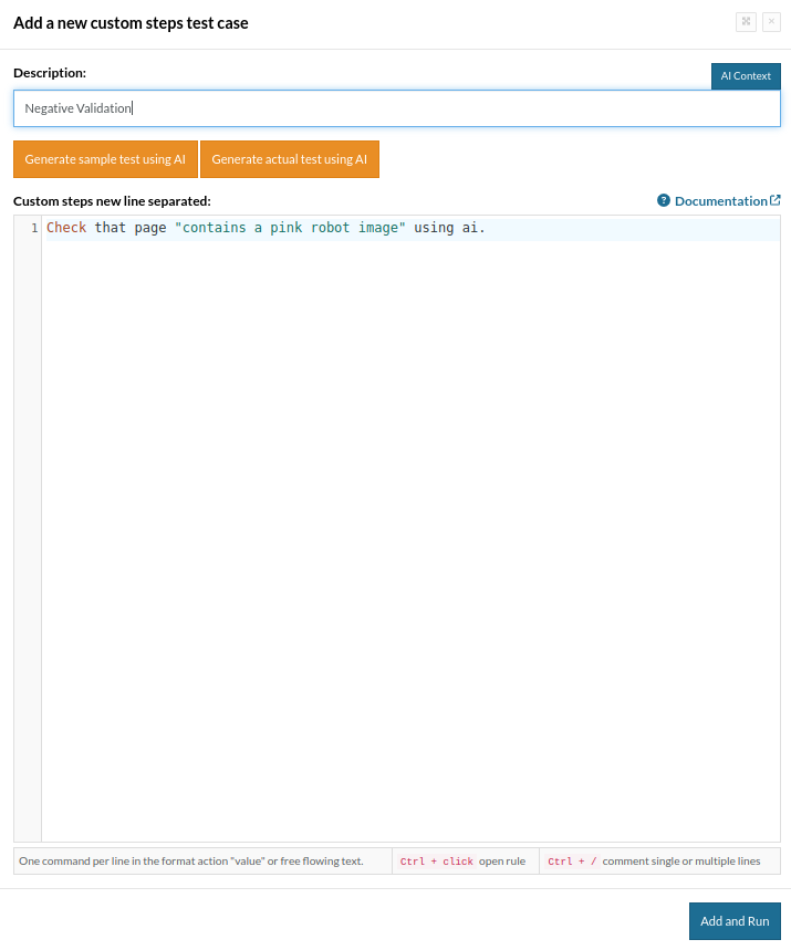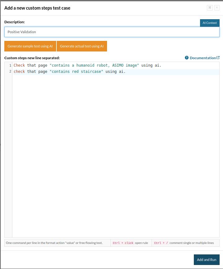 • Contextual Understanding: One of testRigor’s most valuable features is testing with context using the “using ai” command. This allows the system to make intelligent decisions during test execution. For image testing, you can validate that the correct image appears in the correct location, make sure that visual elements are relevant to the content around them, and confirm that image metadata, like alt text, matches expectations.