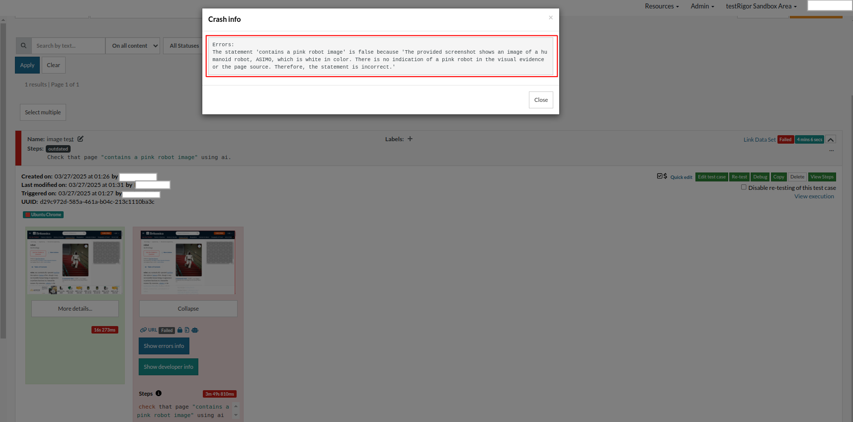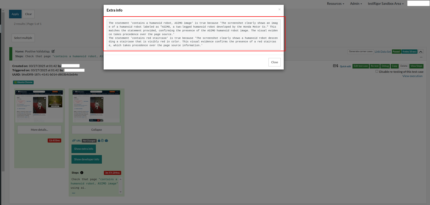 So, let’s execute the test case. The test case will fail, but under the “Show extra info” section, for every step that you test with the “using ai” feature, you can see the AI engine’s explanation for passing or failing it.