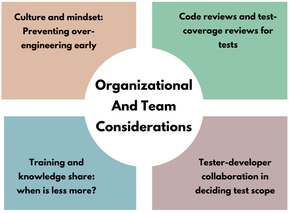 Not only a technical problem, but also generally founded on organizational habits and team culture, over-engineered tests are tests engineered in advance to fail. After all, there is a need to alter the thinking of teams regarding testing, teamwork, and knowledge sharing to avoid it. Some of the primary organizational and team considerations are the following.
