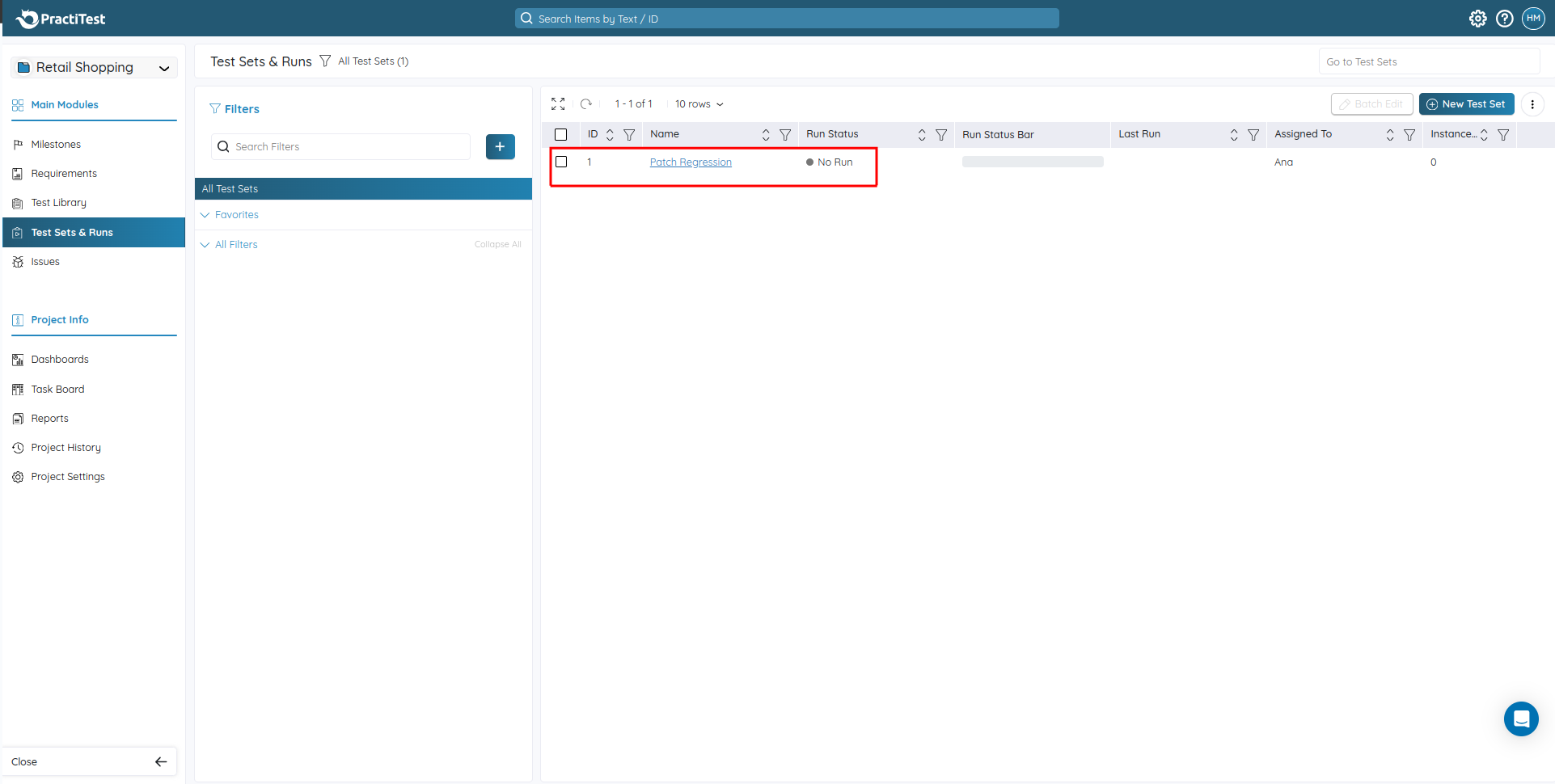 Step 3: The created Test Set can be viewed using the Test Sets & Runs link.