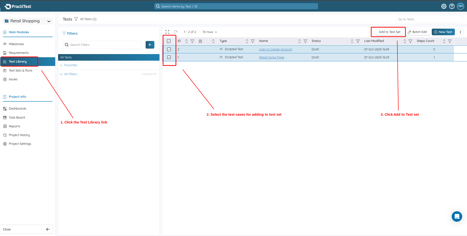 Step 4: To add test cases to the test set, go to the Test Library, Select the test cases you want to add and click Add to Test Set.