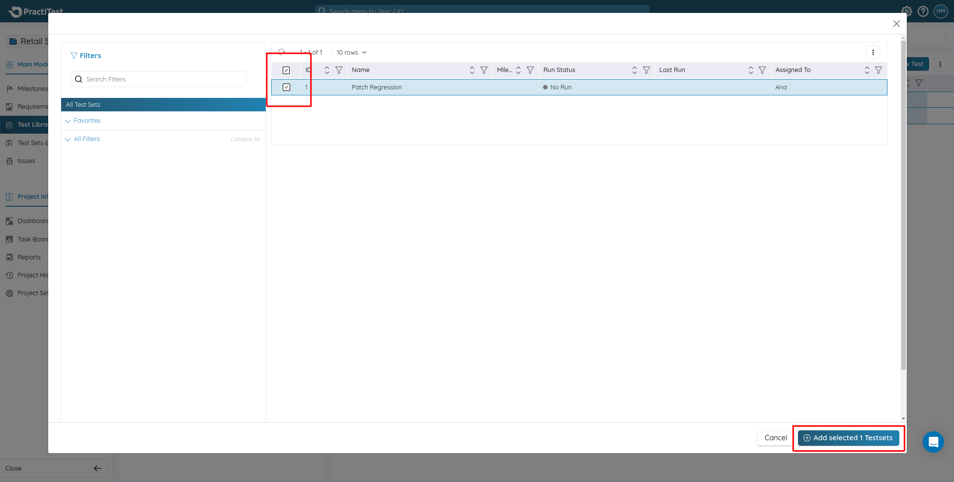 Step 5: After clicking Add to Test Set, a new popup window will appear for selecting a Test Set. Choose the required test set by clicking the checkbox and then clicking Add selected 1 Testsets.