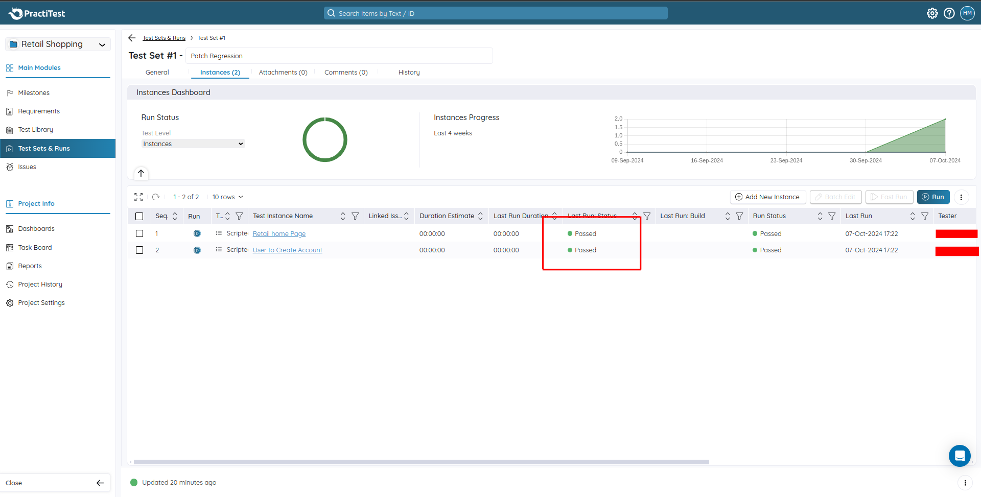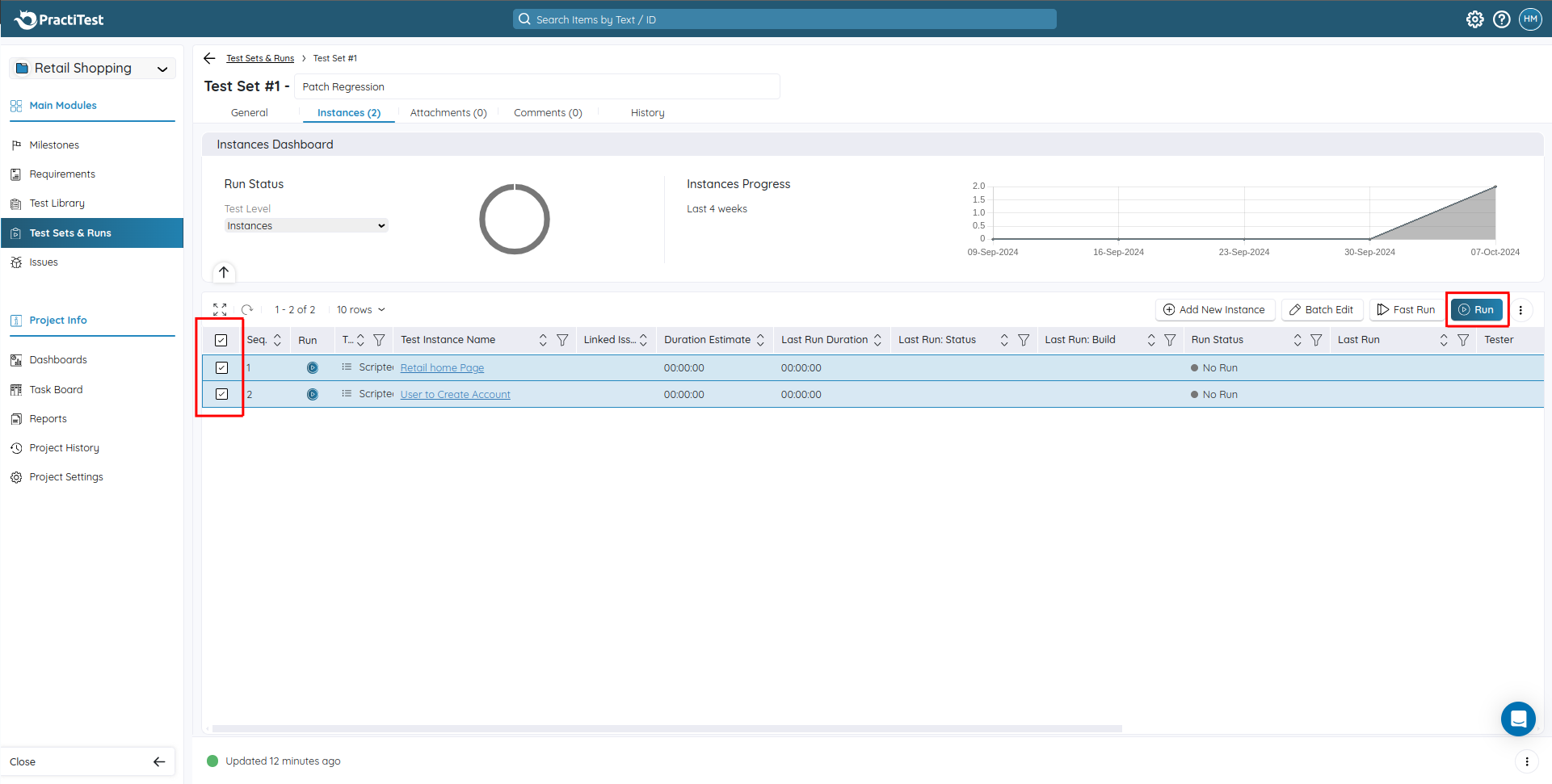 To run the tests, Go to Test Sets & Runs and click the required Test Sets. The detailed Test Set page will be displayed. Select the test cases to execute and click the Run button. You can update the test results for each test case.