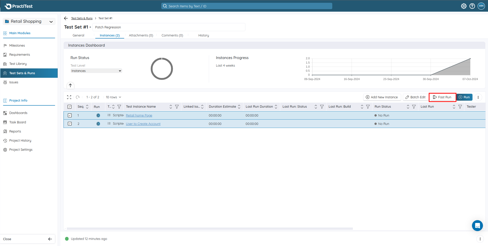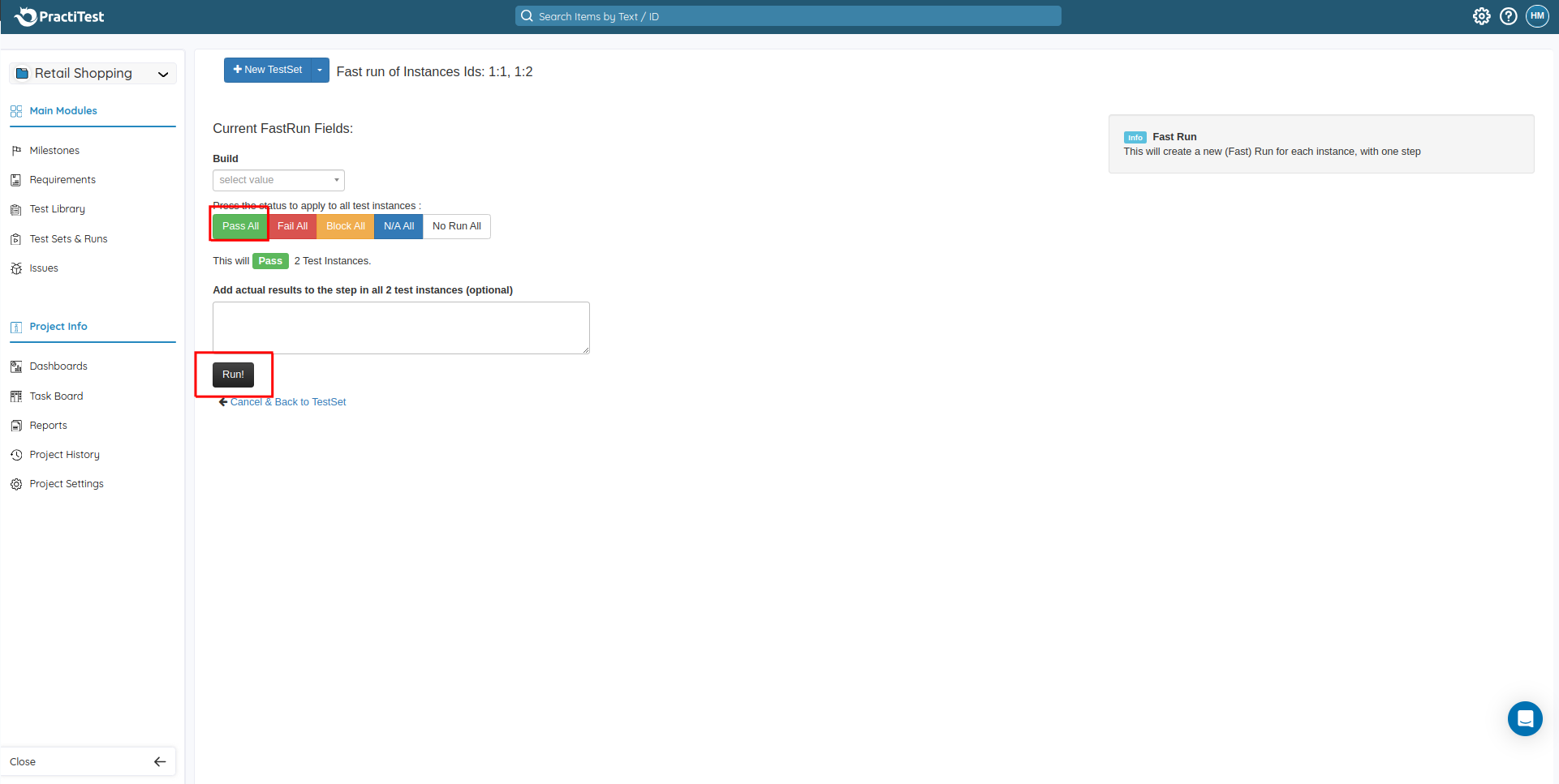 If you have already tested all the test cases and all have passed, in this case, you don’t have to click each test case and mark the status separately. Instead, you can use the option “Fast Run“.