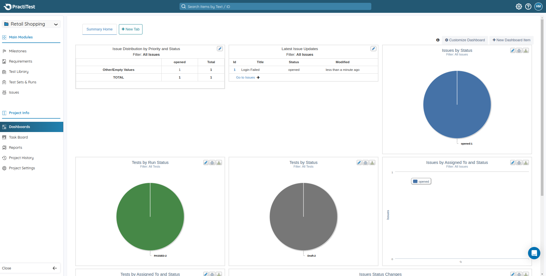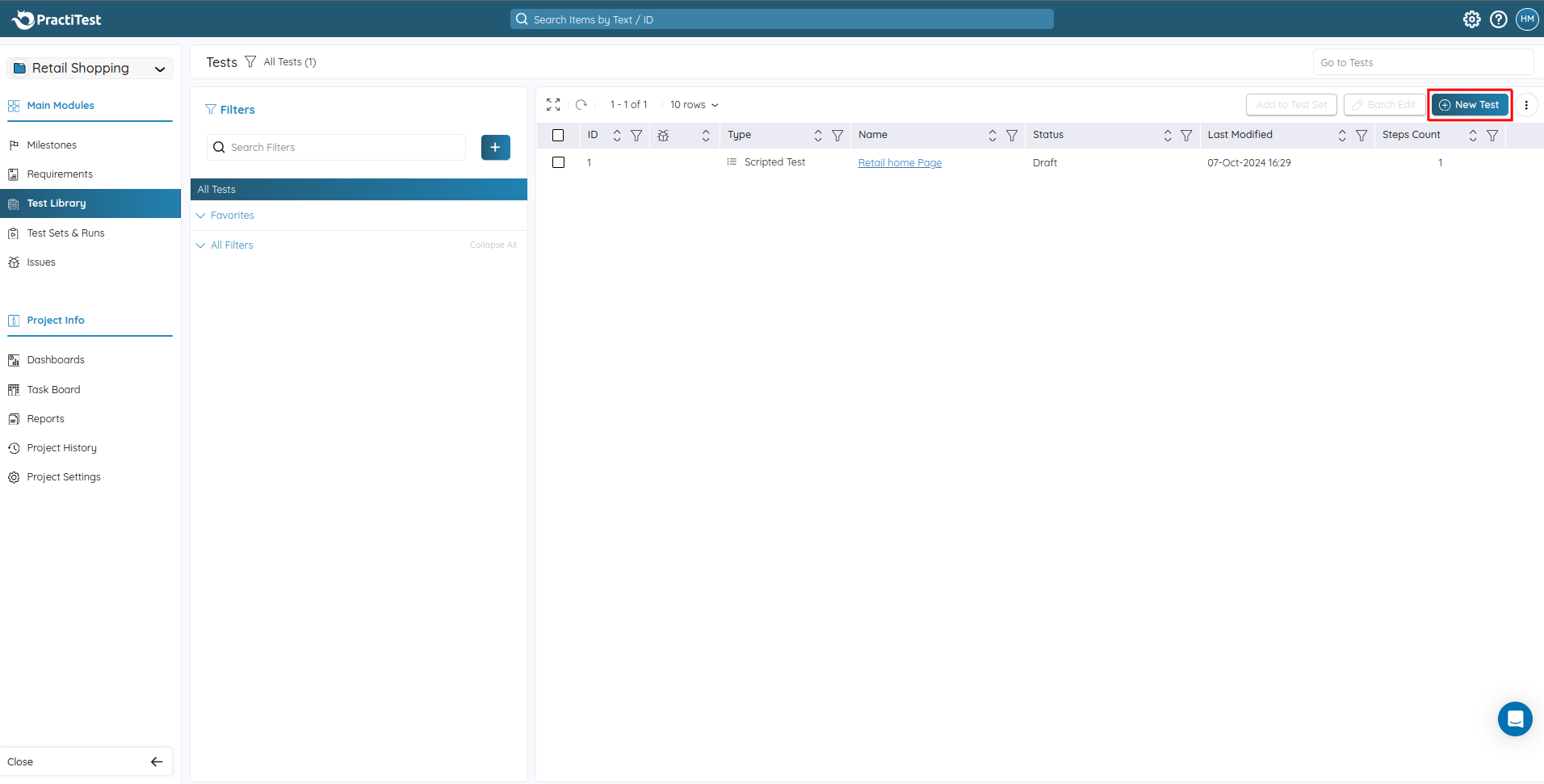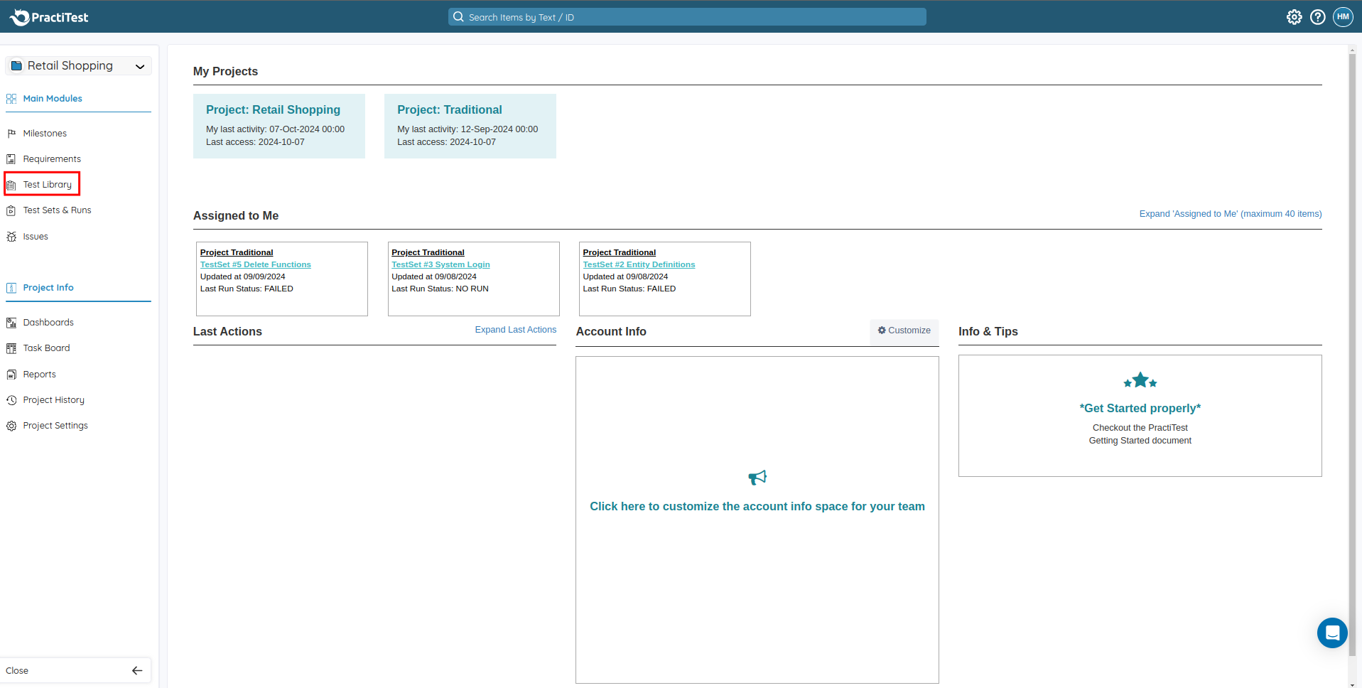 After logging into PractiTest, the home page will appear, showing an overview of your projects and tasks assigned to you. On the left side, you’ll find Main Modules with links to key sections such as Milestones, Requirements, Test Library, Test Sets, and Issues. Additionally, there are links for Dashboards, Reports, Task Board, Project History, and Project Settings under Project Info.