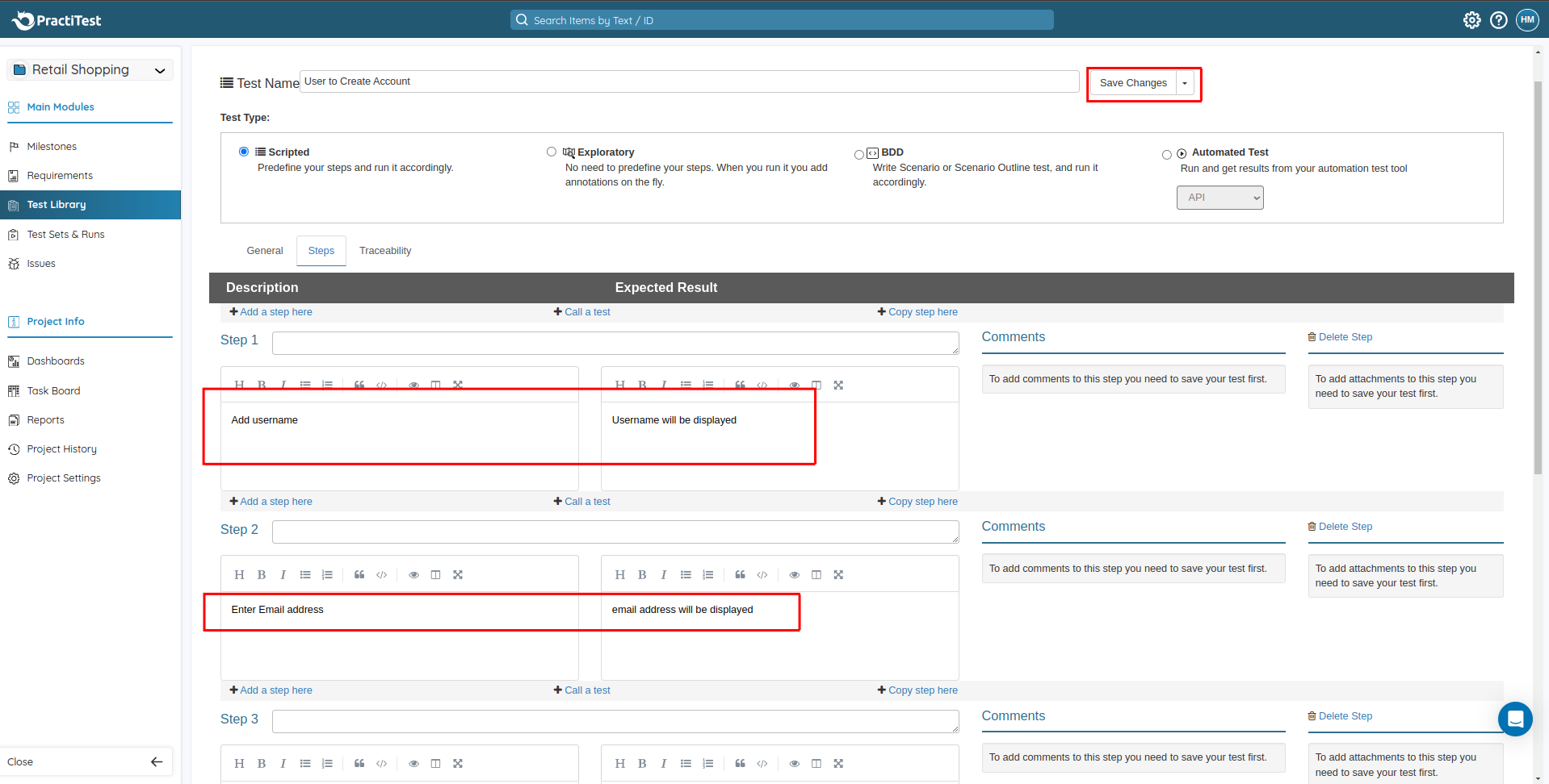 Step 4: After adding the test steps and other details, click Save Changes.