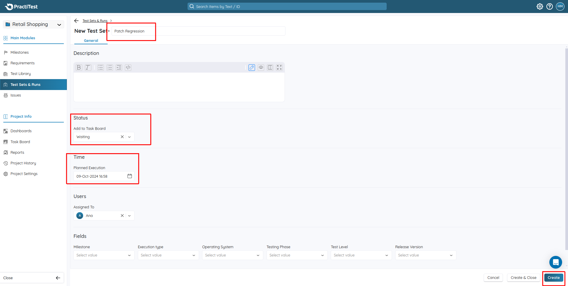 Step 2: Once you click the New Test Set button, a new page appears with the option to create a Test Set. You can add the test set name, Status, and planned execution date and assign it to a team member. After adding these details, click the Create button.