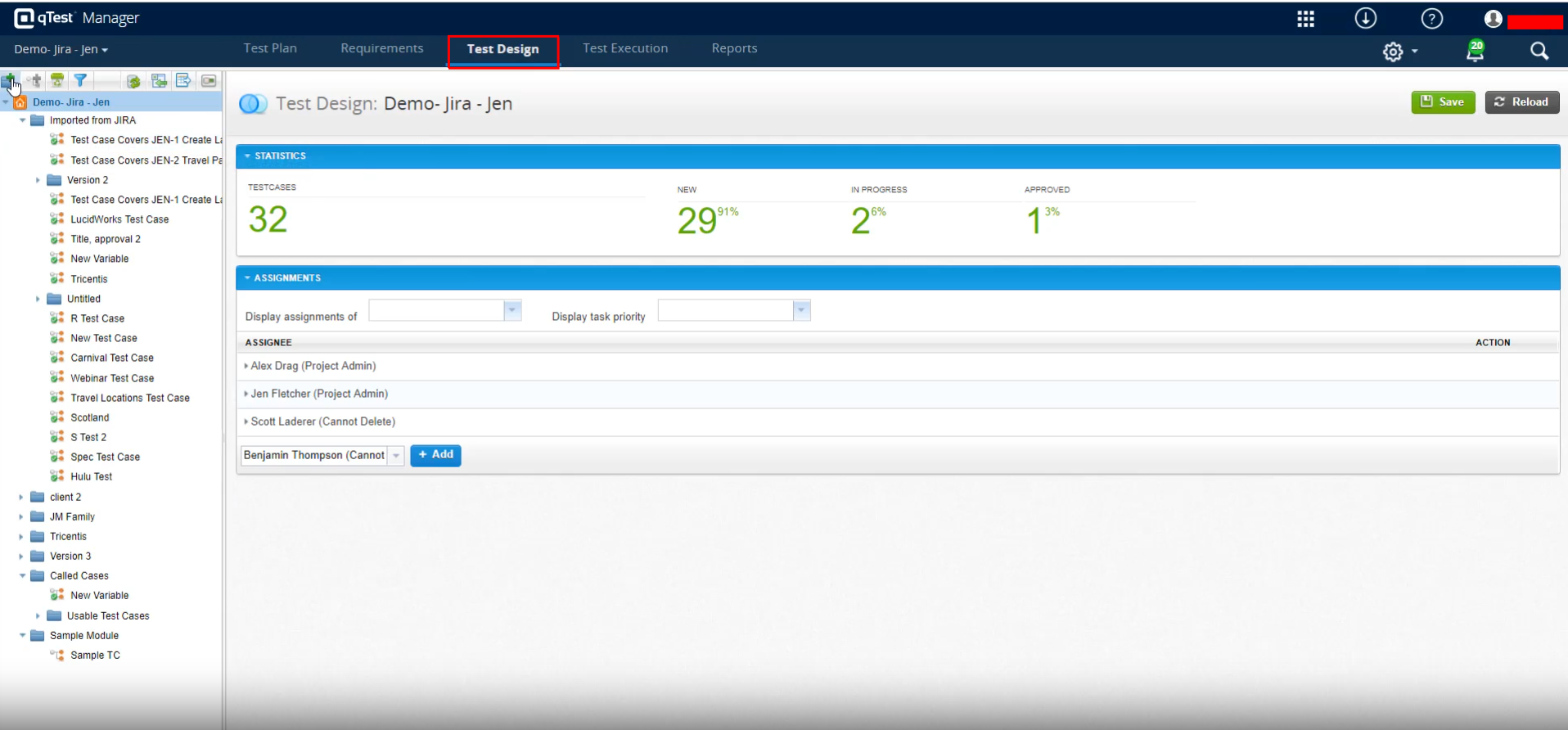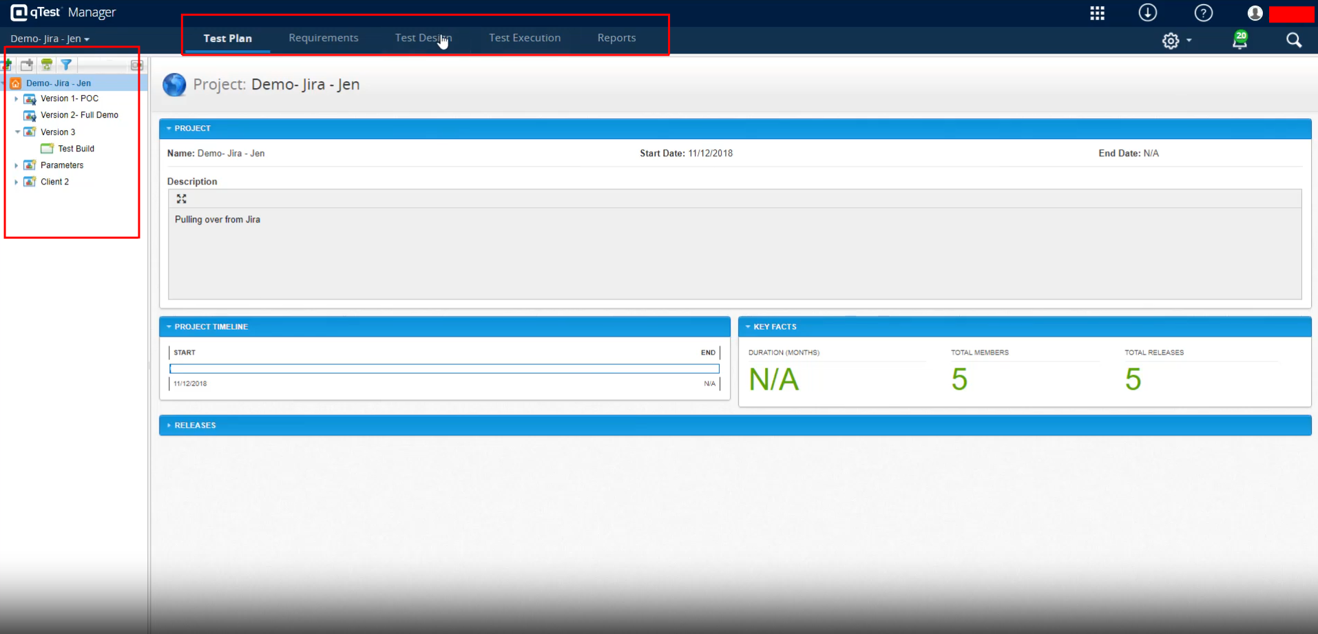 Once you log in to qTest, you can see the list of projects on the left-hand side tab. Also, in the center, you can see the project statistics. On the top, you can see different tabs, including Test Plan, Requirements, Test Design, Test Execution, and Reports.