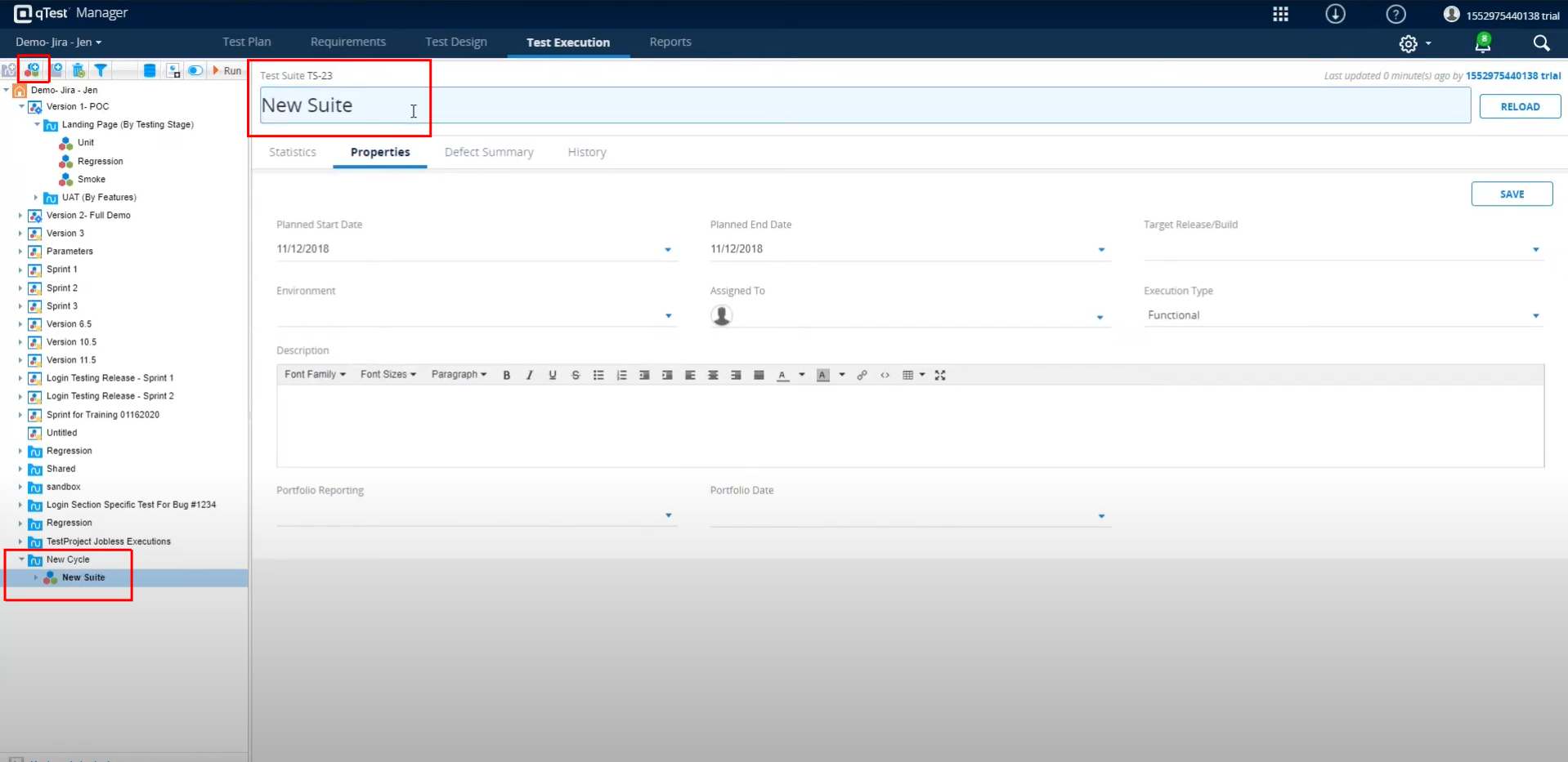 Step 10: Next, we need to create the Test Suite. Click the New Test Suite icon on the left-hand panel. The new test suite will be displayed under the test cycle.