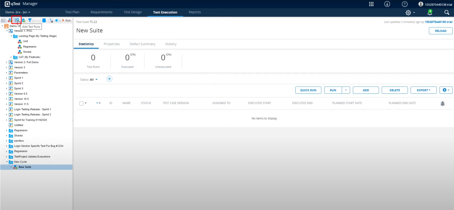 Step 11: Next, we need to add test runs. To do that, click the Add Test Runs icon on the left-hand menu.