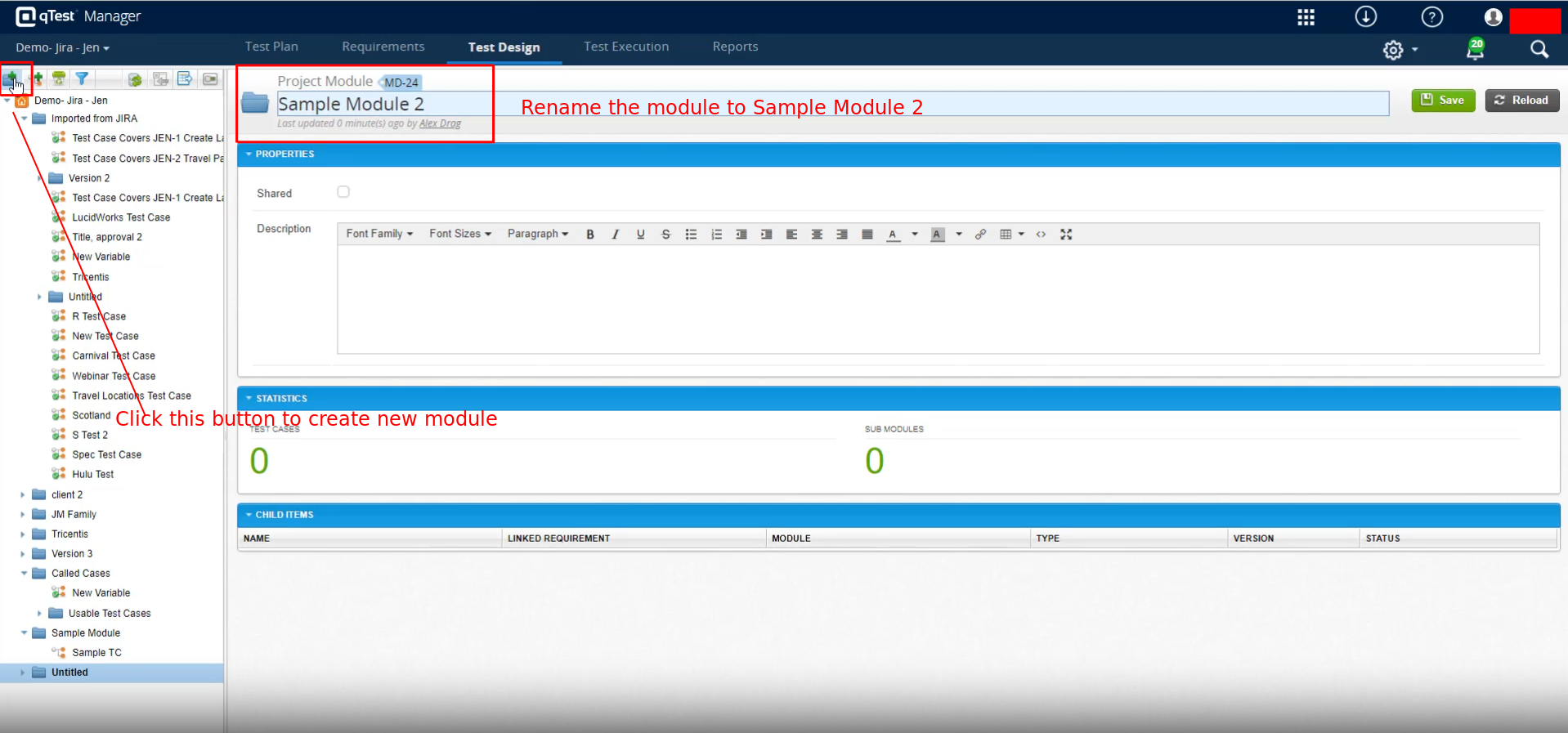 Step 2: Usually, test cases are created inside the modules. So, before creating the test case, we need to create a module. To create a module, click on the folder icon with a plus mark on the left side menu.