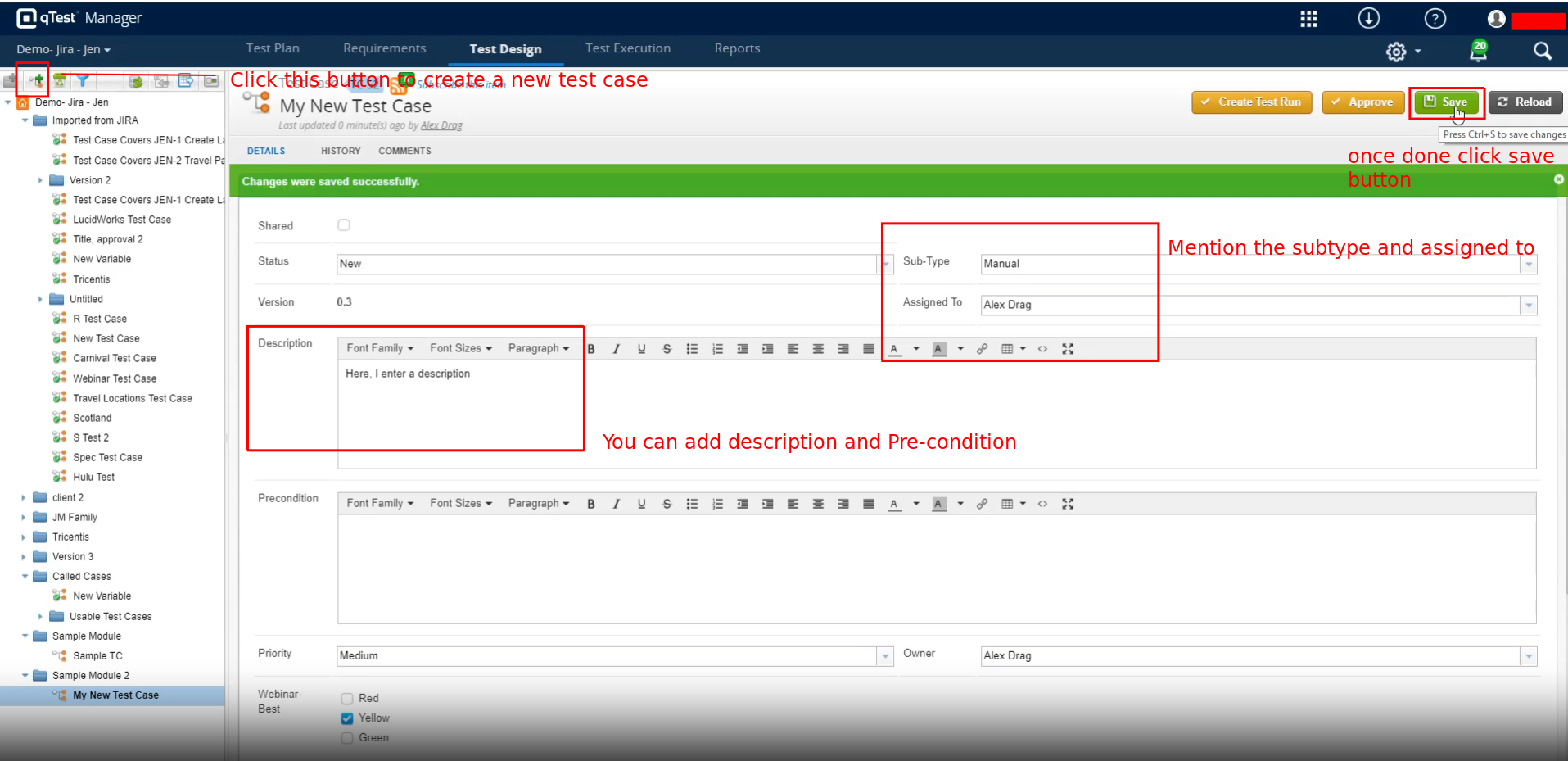 Step 3: Next, we need to create the test case. Click the New Test Case icon on the left side menu to do that. The new test case page will open. You can add the Description, Precondition, Sub-Type, Assigned to, etc. Once you add the details, click the Save button.