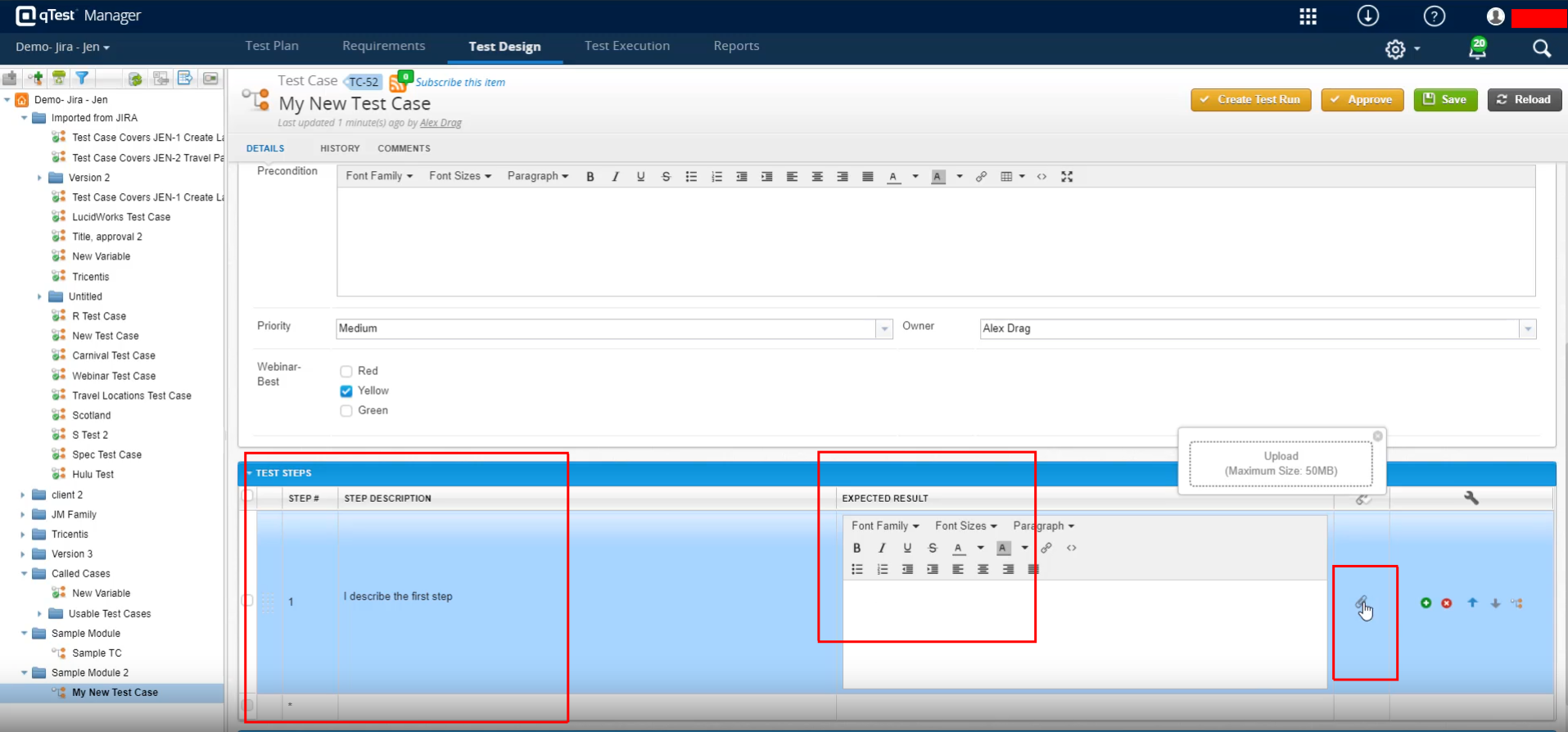 Step 4: Now, let’s see how to add Test Steps. So, on the test case creation page, scroll down to see the option to add Test Steps. You can add the step description and the expected result. Similarly, you can add multiple steps. Also, if you need to attach some files, like a test data sheet for any particular step, you can do so.