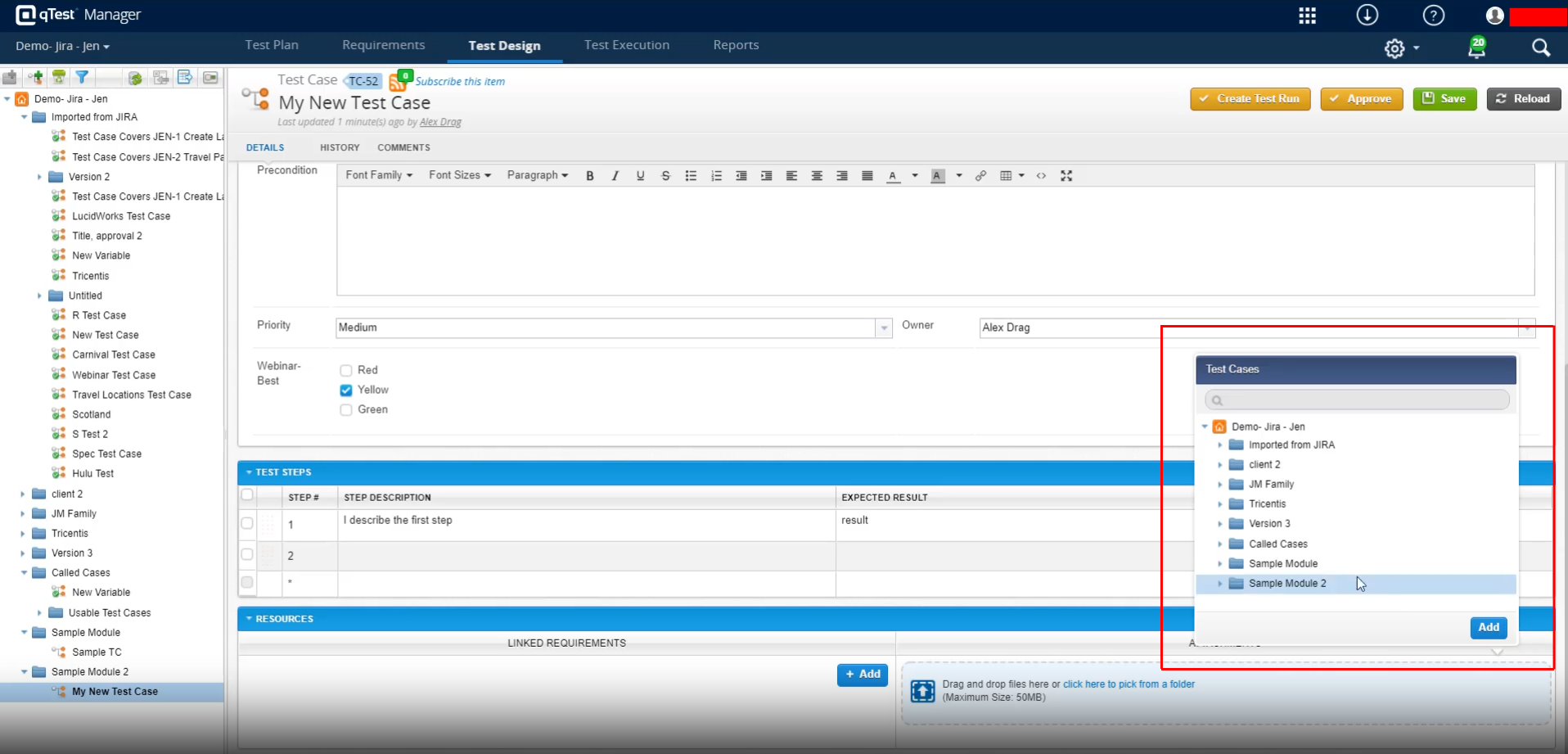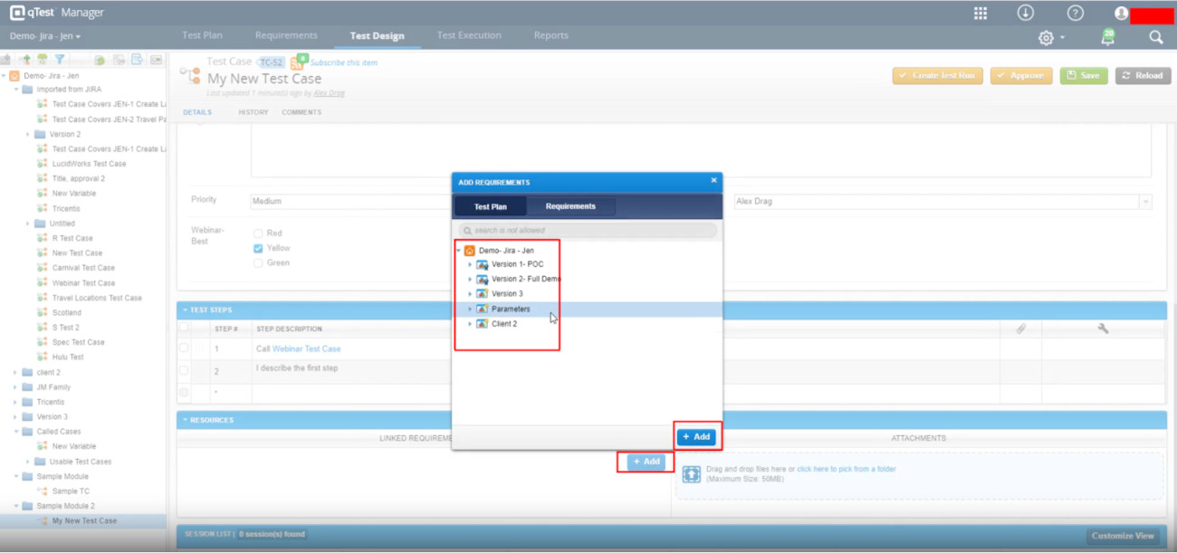 Step 8: Similarly, to map requirements to a test case, you can click the Add button on the Linked Requirements tab and then select the requirements from the popup.