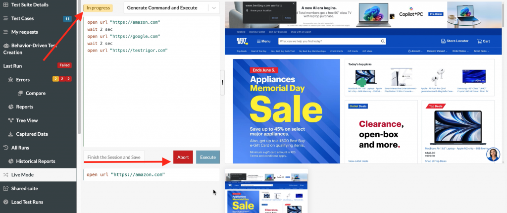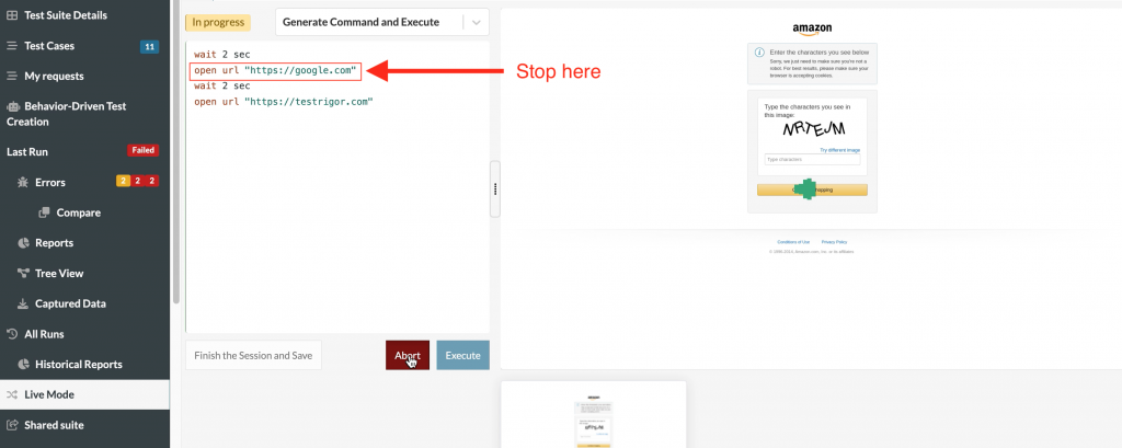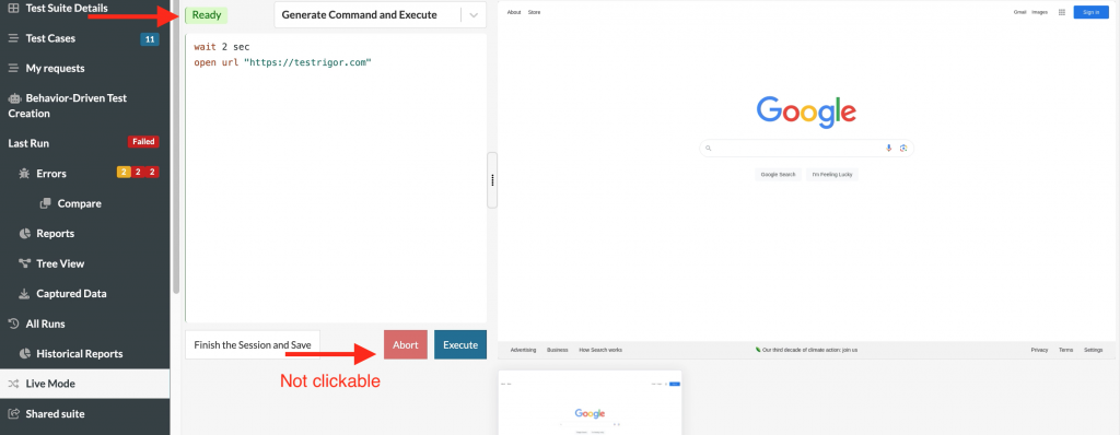 • While a Live mode session is in progress, you will see the the Abort button, which will only be clickable after Execute is clicked. See the screenshots below: