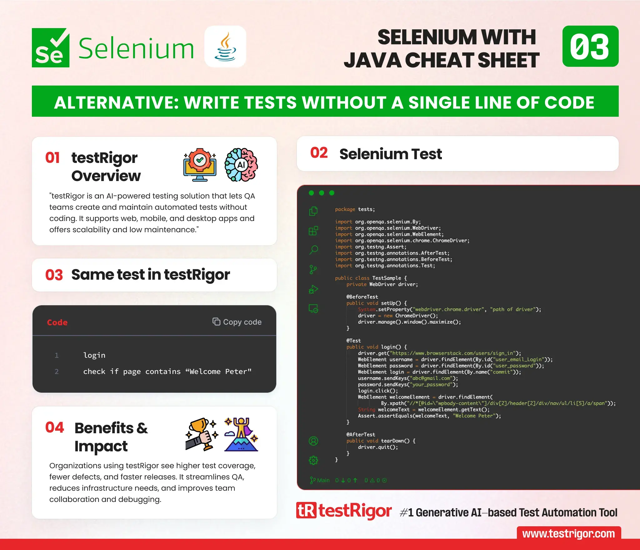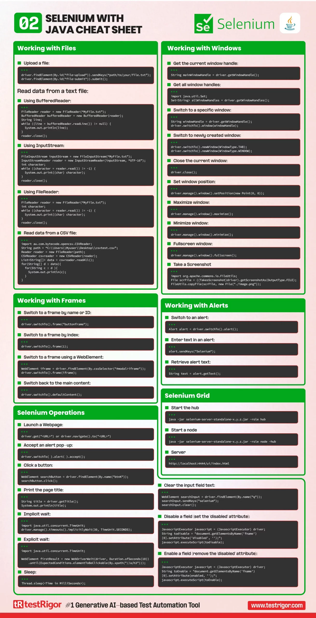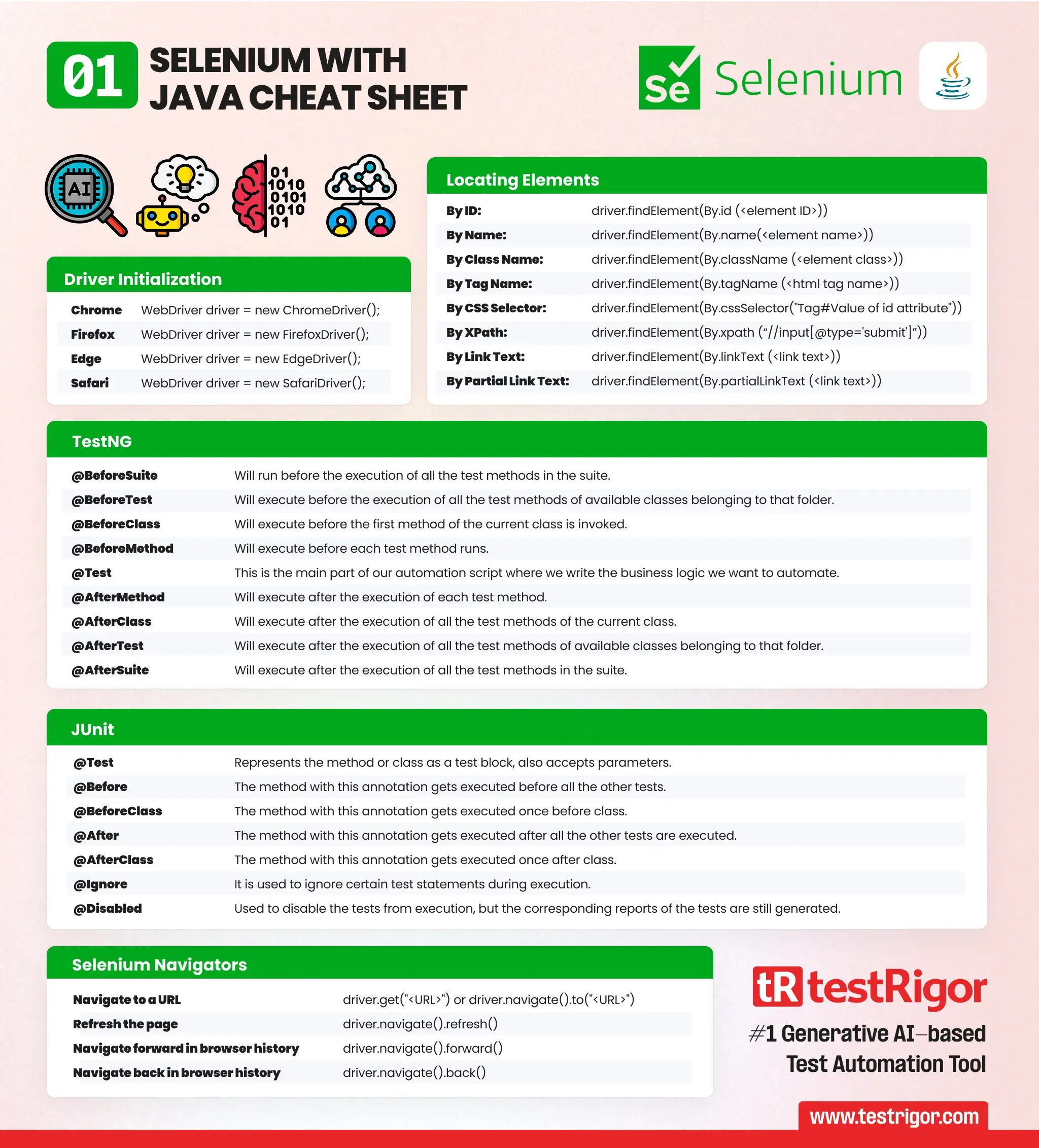 | Navigate to a URL | driver.get("<URL>") or driver.navigate().to("<URL>") |