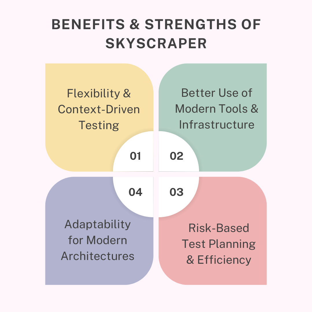 | Risk-Based / Context-Driven Testing | Testing effort is prioritized based on risk, business impact, complexity, and areas prone to failure. | The Skyscraper aligns naturally with this approach since each test “floor” is built according to real needs, allowing teams to invest where risk is highest. |
