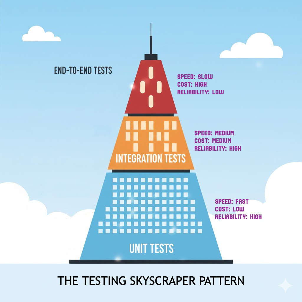 Thus, the development and testing landscape has changed dramatically. As a result, the assumptions underlying the Testing Pyramid no longer always hold. Because of these shifts, clinging rigidly to the Pyramid structure, especially its implied quotas, can become limiting, inefficient, or even harmful in modern contexts. This is where the Testing Skyscraper pattern comes into play.