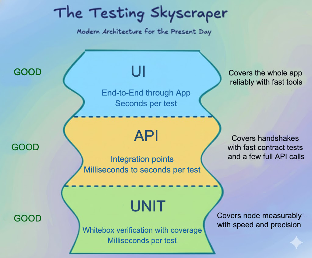 But modern engineering practices, distributed architectures, and AI-powered interfaces have transformed the way applications work and the way we interact with them. The old pyramid is outdated and no longer accurately represents modern systems. New thinking is now emerging that suggests testing should grow tall, like a skyscraper, but be flexible enough to include layered complexities, connected services, and wider-reaching user journeys.