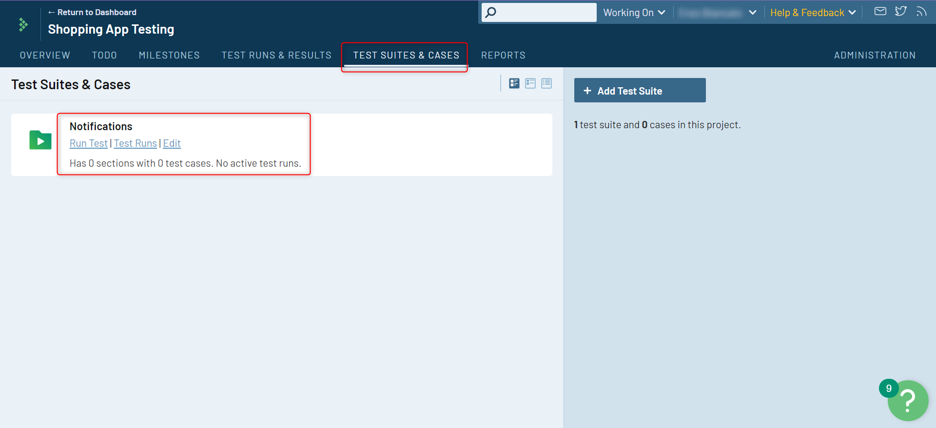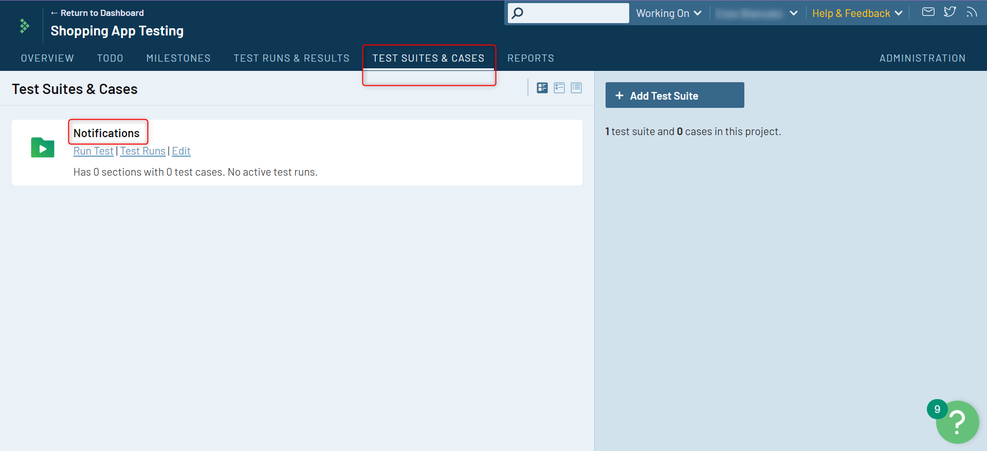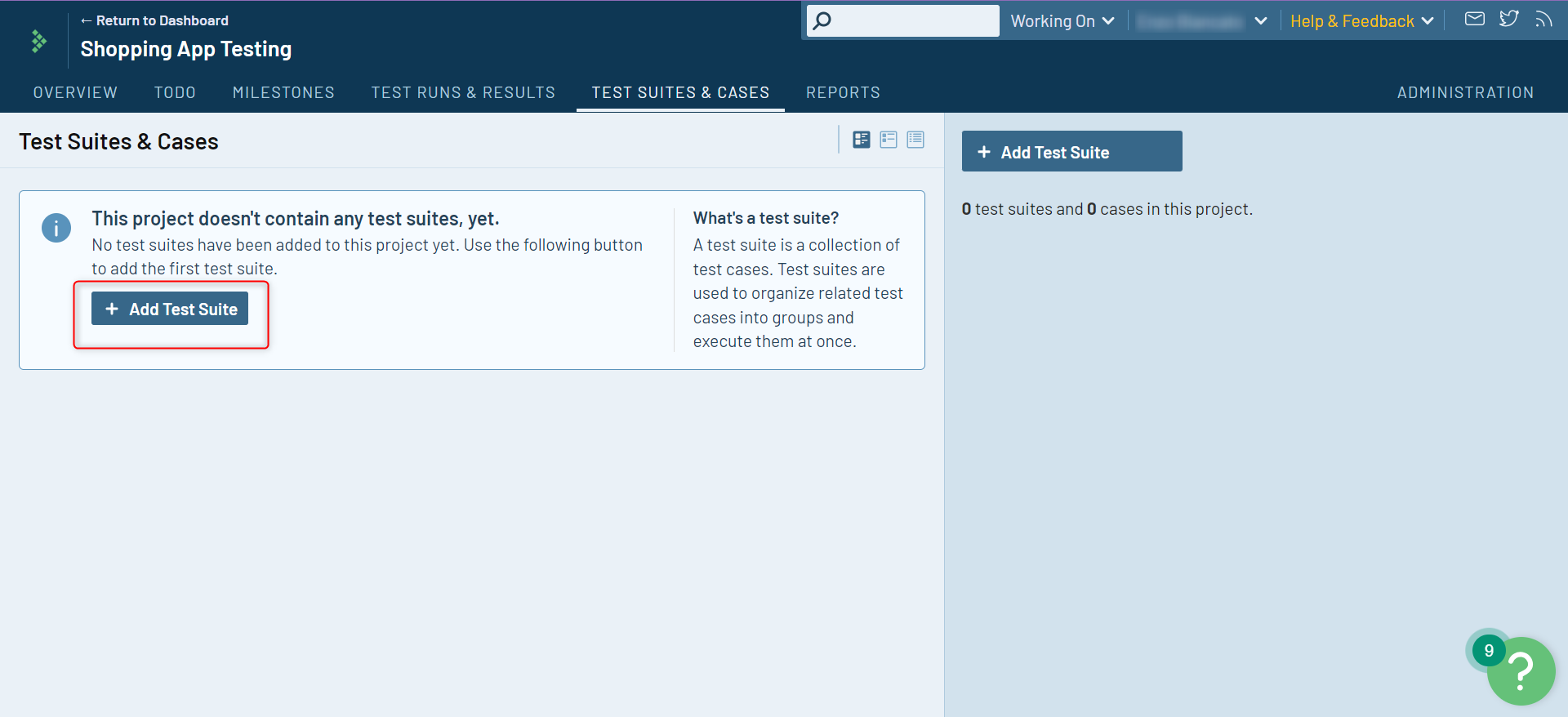 Step 1: Go into your project. You can do this by clicking on the project of choice on the Dashboard and then on Test Suites and Cases within the project.