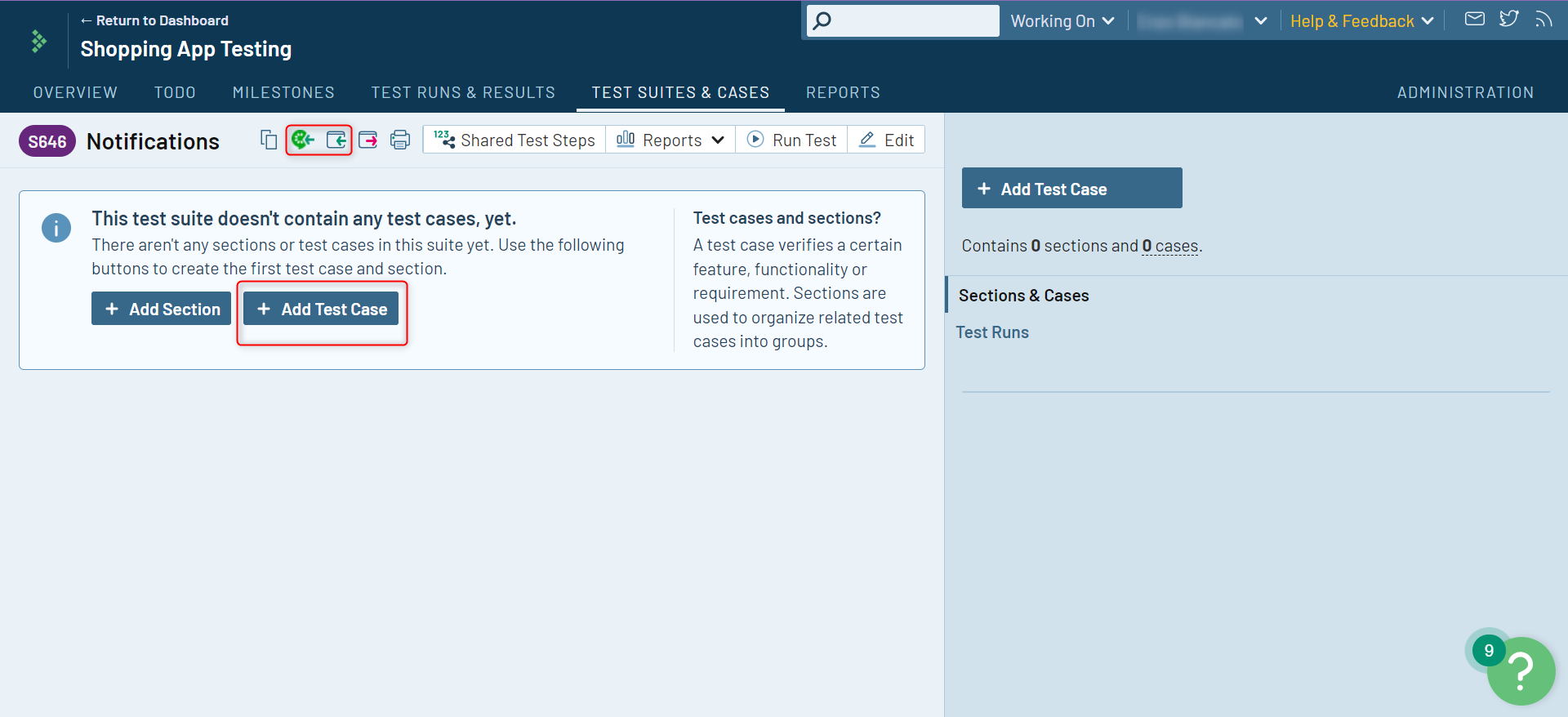 - Sections and Milestones: Further organize test suites into sections and assign milestones for progress tracking.