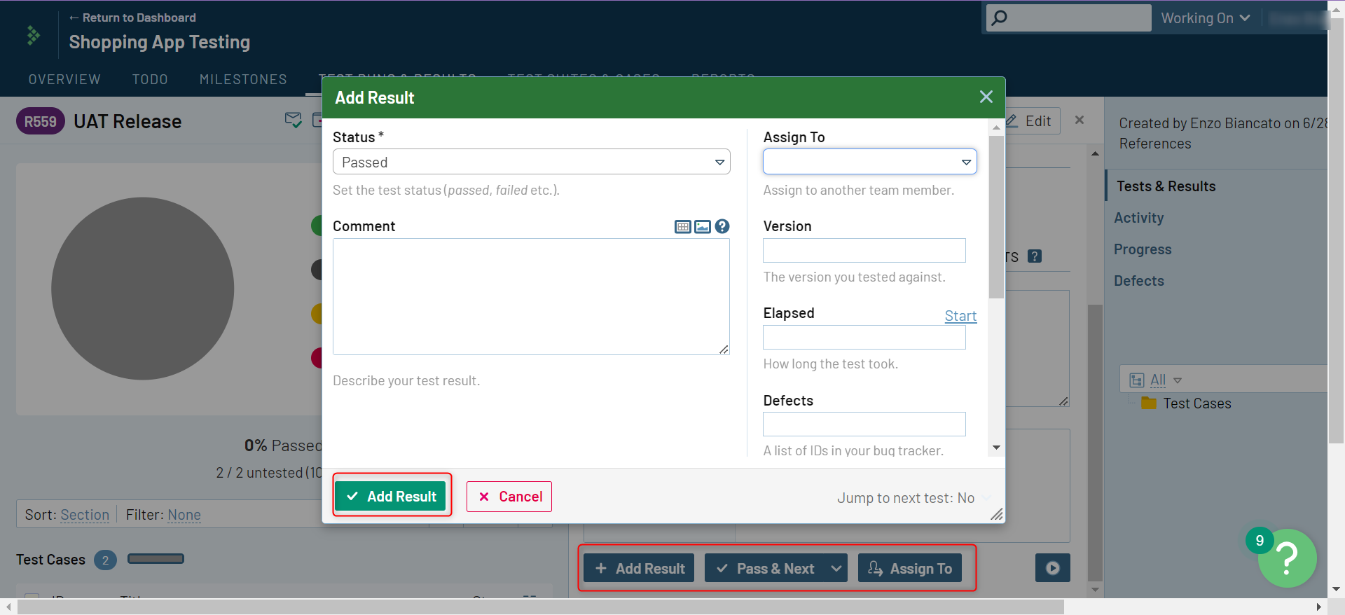 Step 1: Use the Add Result to add the test case result, or use the Pass & Next drop-down. You can also assign this test case to another team member through the Assign To. There is an option to provide Results & Comments in the text for better understanding.