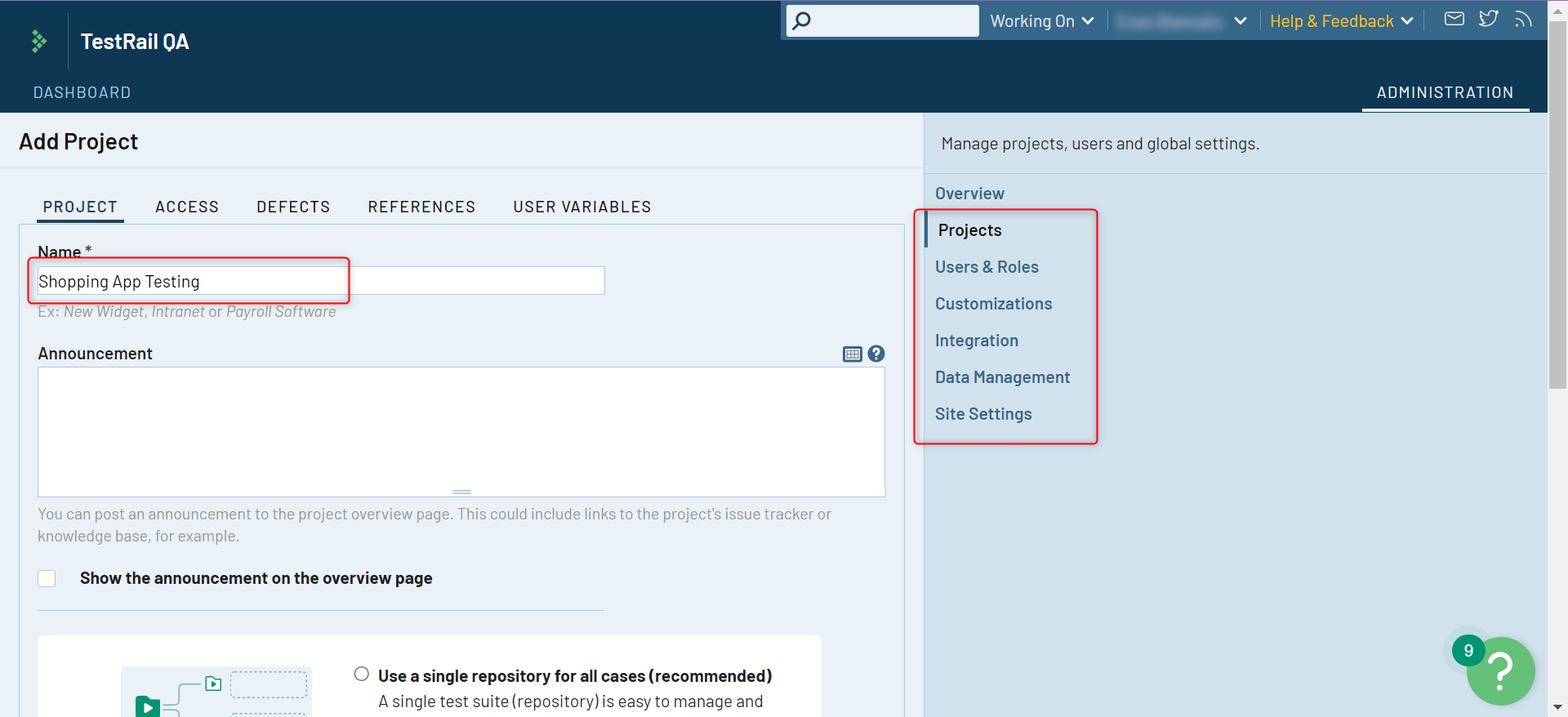 Create a TestRail Project