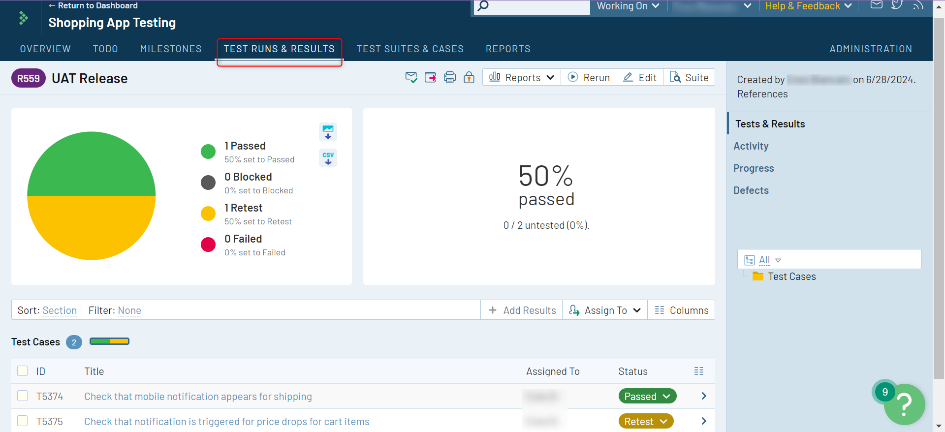 Once statuses are updated for the test cases, you will see the updated charts showing the progress under Test Runs & Results.