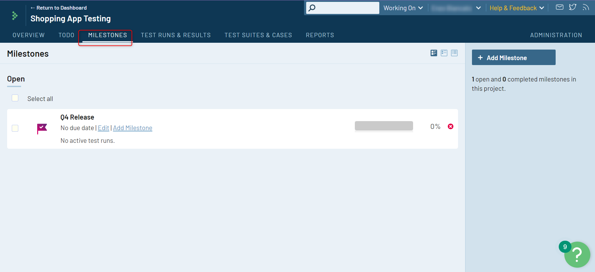 To further organize and share your testing operations, use the Milestones tab. Milestones help you create goals, which you can achieve through regular test runs.