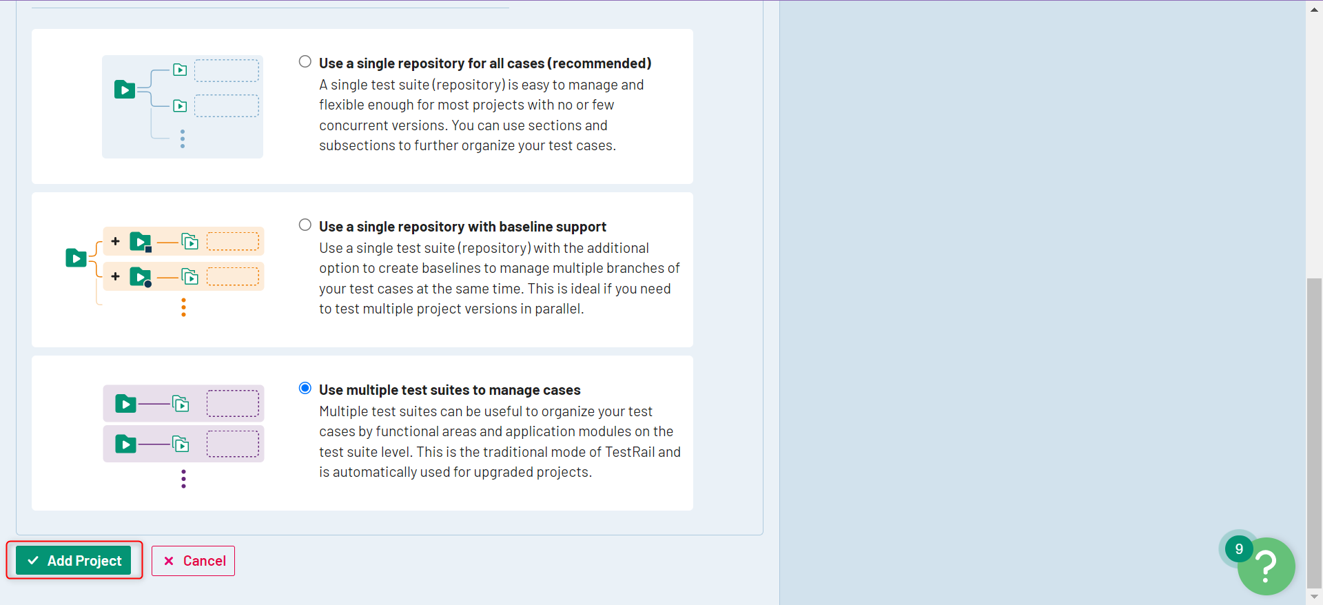 Scrolling down, you can choose how you’d like TestRail to organize your test cases. Choose an option and then click on Add Project.