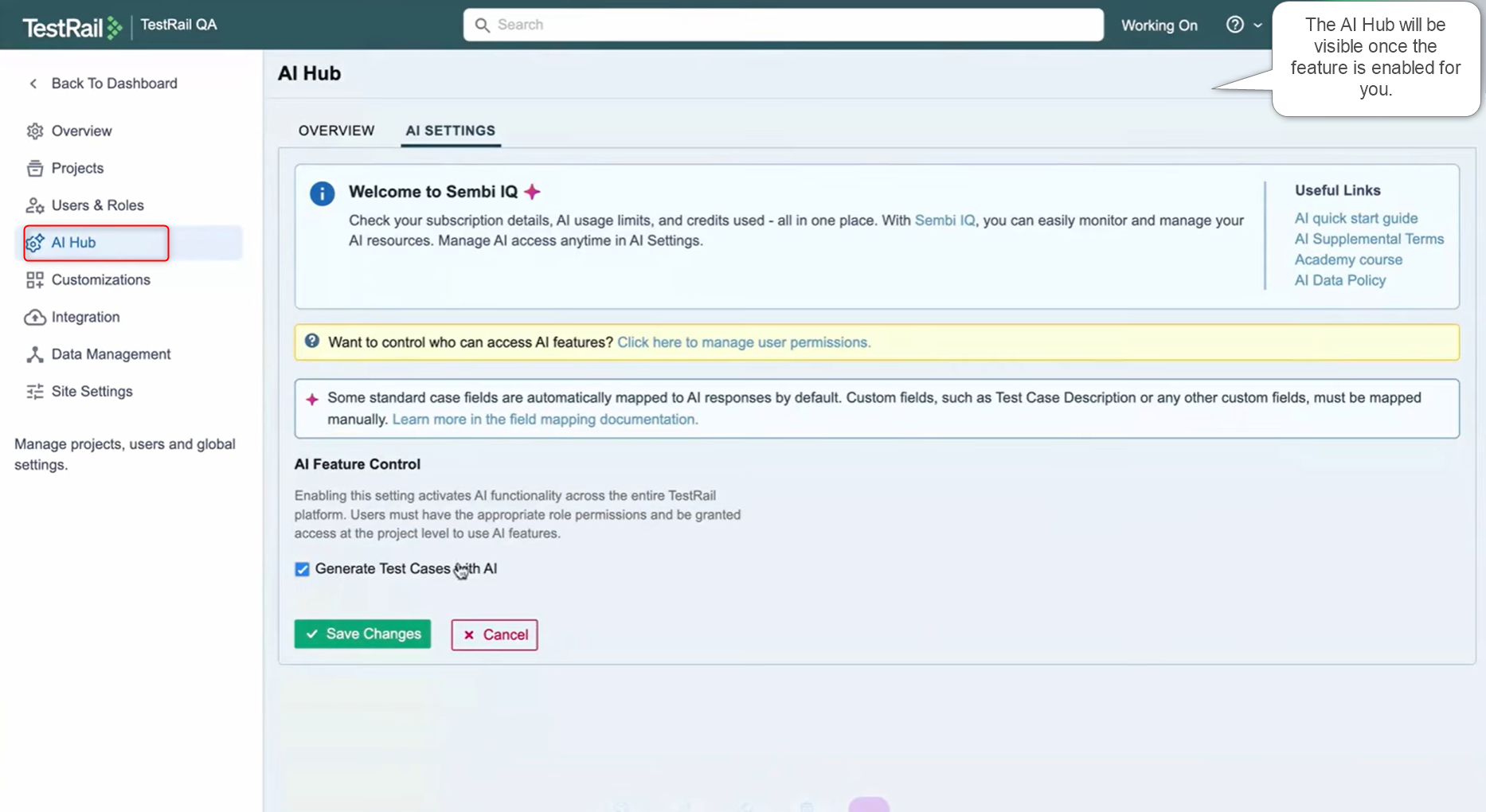 This AI feature is available within TestRail’s plans and is disabled by default. Once you have access to this feature, the AI Hub will be visible to you.