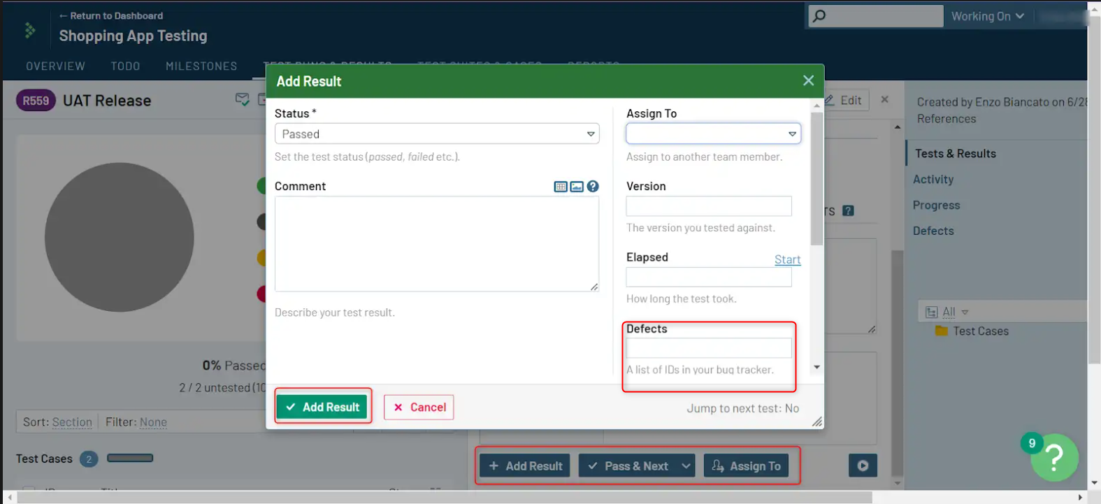 You can additionally add details about any defects that were identified during the test case run as a part of the Add Result section mentioned above.