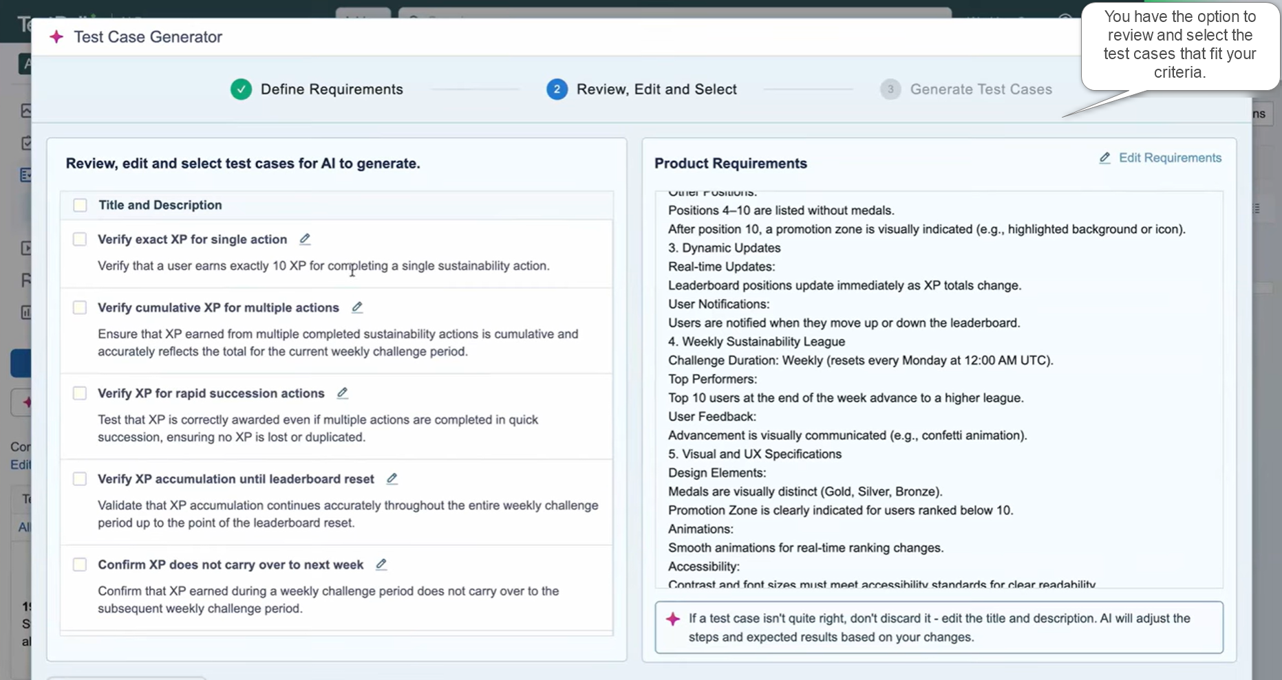 - Human-in-the-Loop Control (Review and Edit): Before the AI automatically creates all the final test case details, it first gives you a list of suggested test case titles and brief descriptions. You can review this list, edit any suggestions you don’t like, or remove the ones that aren’t necessary. Only after you approve the list does the AI create the full, detailed test steps.