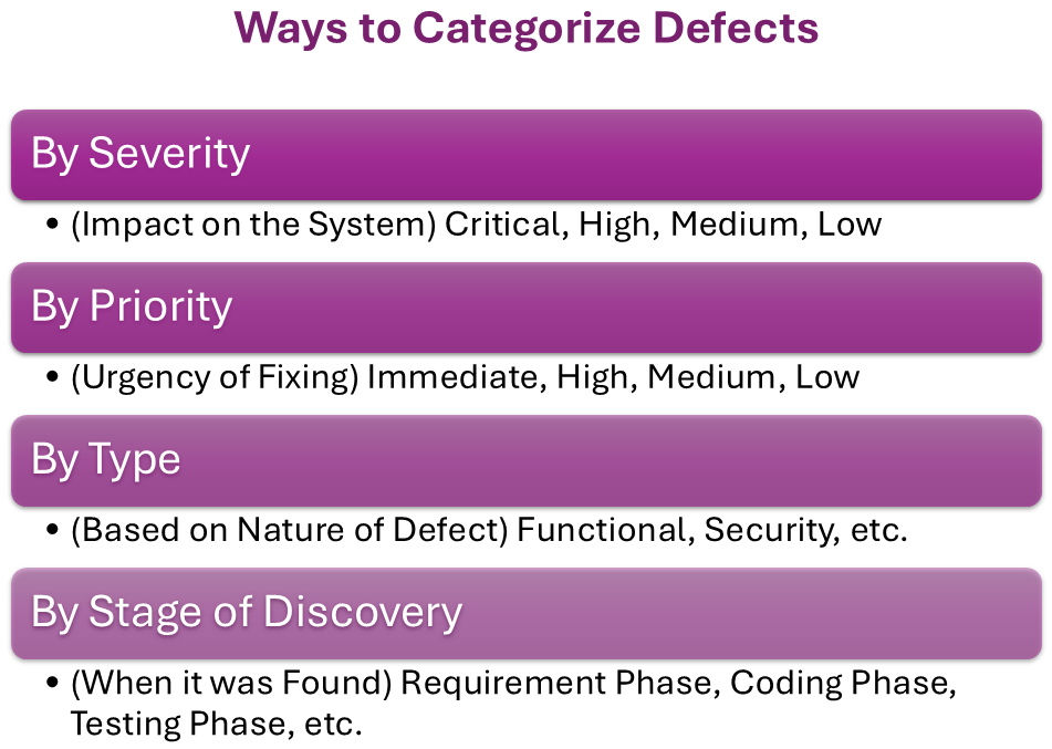 • Assign Defect Priority: Not all defects are equally important. Some defects can break the software, while others might be cosmetic issues. Classify defects by their severity (how serious they are) and priority (how urgent they are to fix). For example, we should fix a bug that crashes the app before a minor typo in the text.