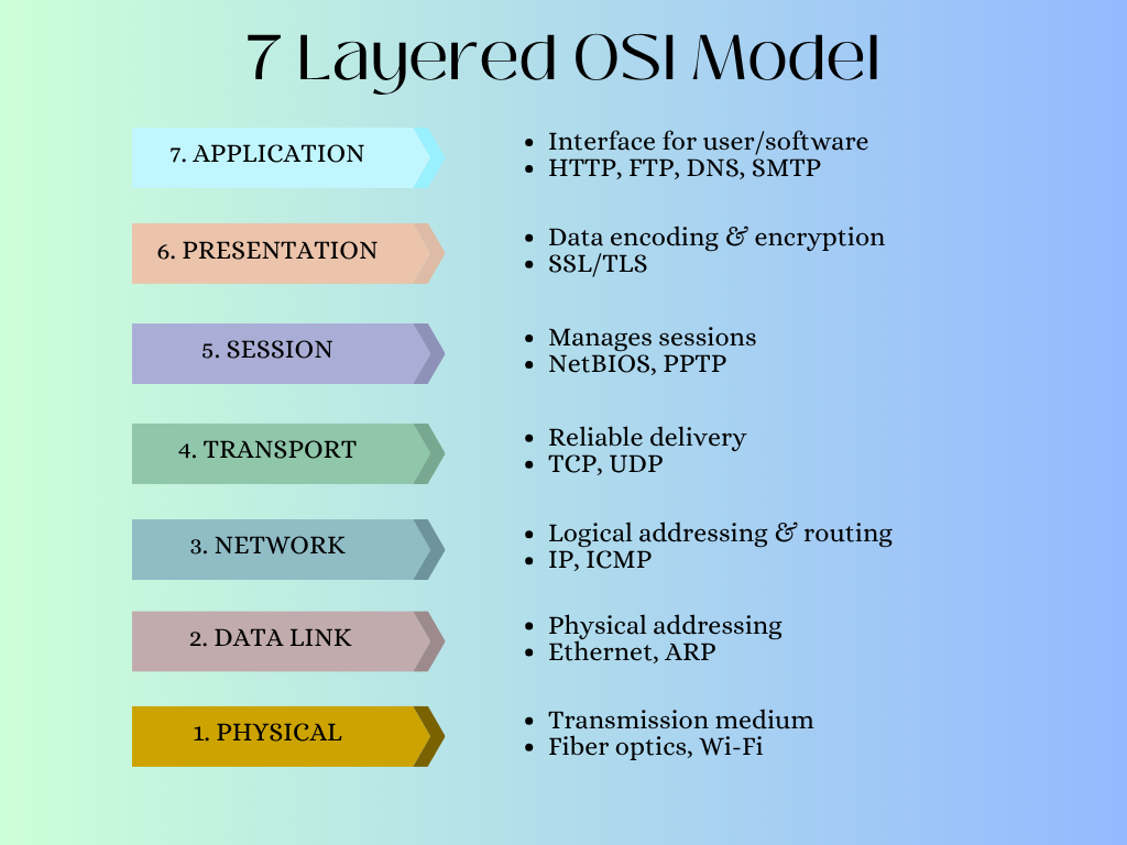 As shown in the figure, the lowermost layer is the physical layer, and the topmost layer is the application layer. The physical layer deals with hardware and physical devices. As the model progresses layer by layer, the last one, the application layer, is the actual interface or application that the user can see.
