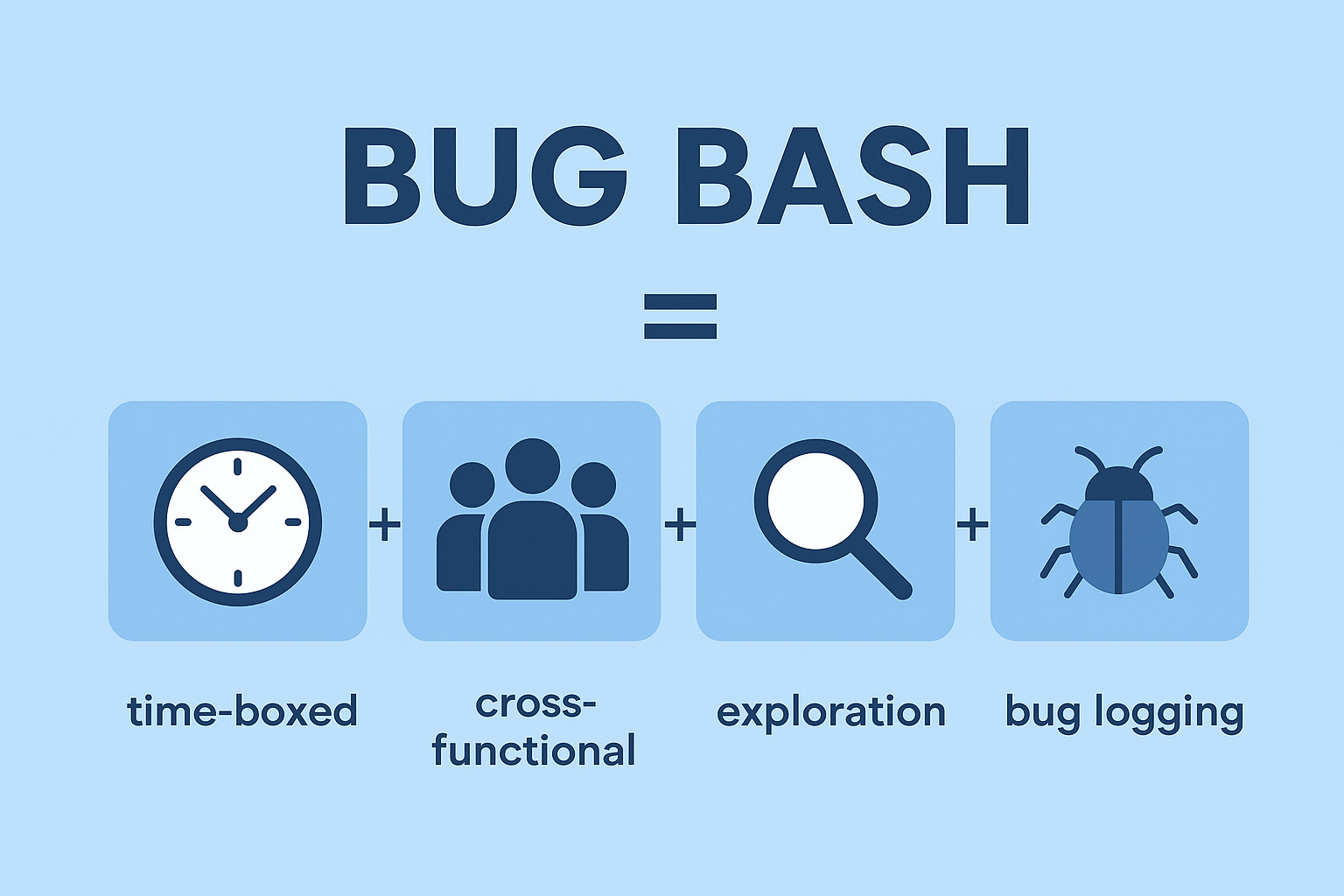 • A bug bash is a time-boxed, cross-functional testing event where the whole team — not just QA — explores the product to find bugs, usability issues, and edge-case problems before release.