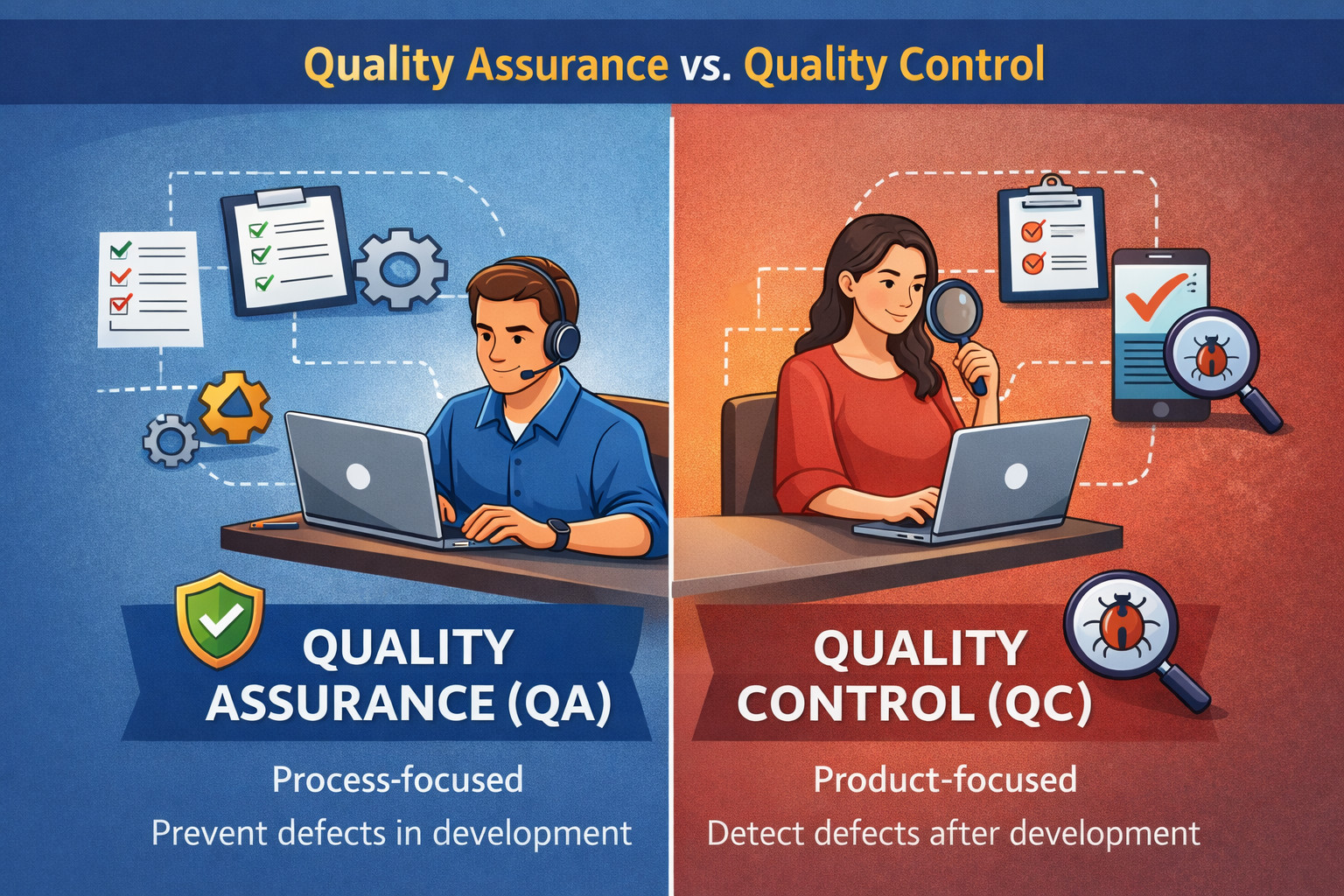 • QA focuses on improving processes to prevent issues, while QC concentrates on detecting defects in the finished product.