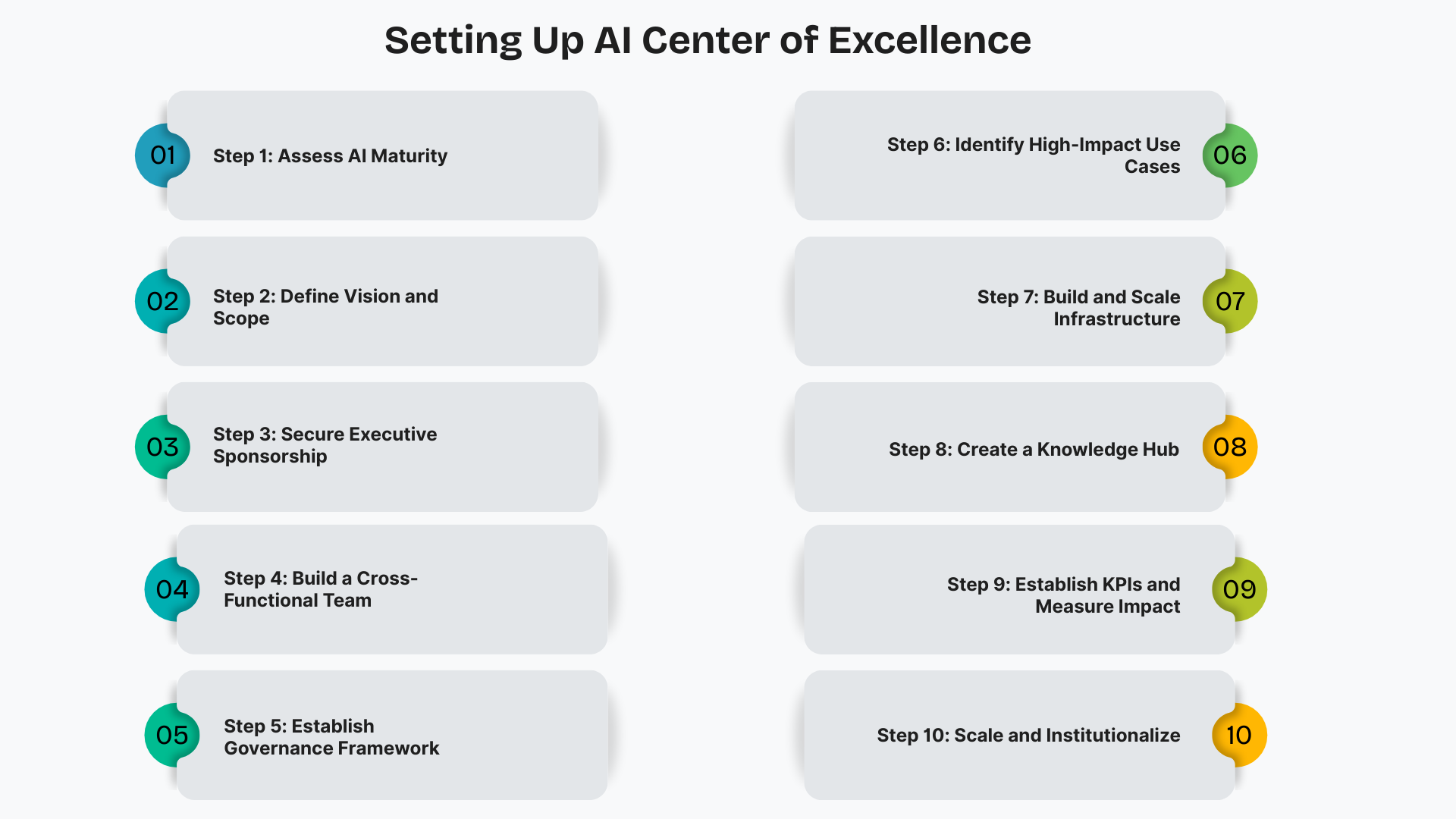 - Step 10: Scale and Institutionalize: The last step is to scale and institutionalize AI efforts organization-wide. That includes building AI solutions into pre-existing systems, fostering a culture of innovation, and ensuring that AI initiatives are sustainable and aligned with the business.