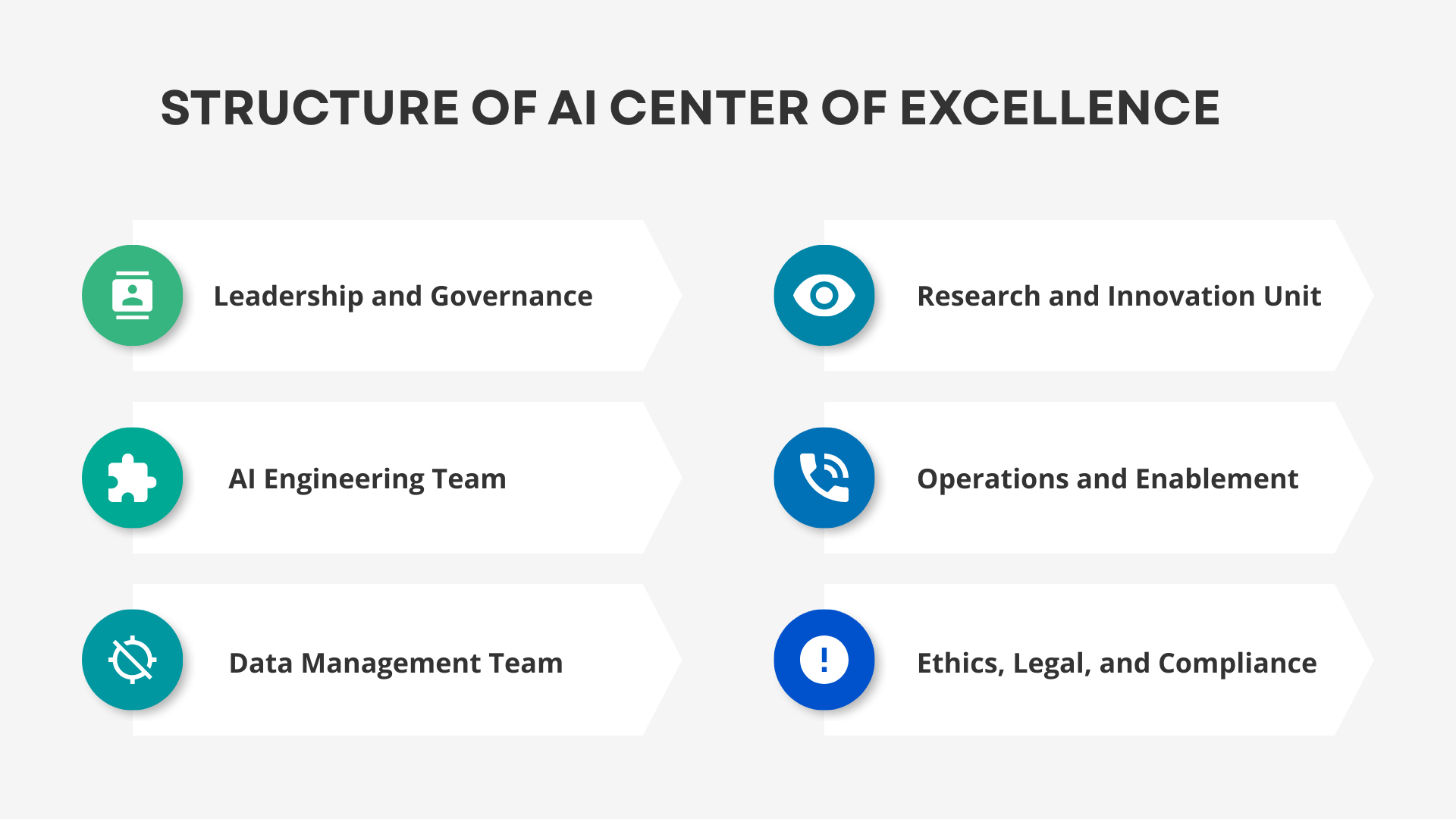 Depending on how big and complicated the organization is, the structure of an AI CoE can be different. But most AI CoEs have the following parts: