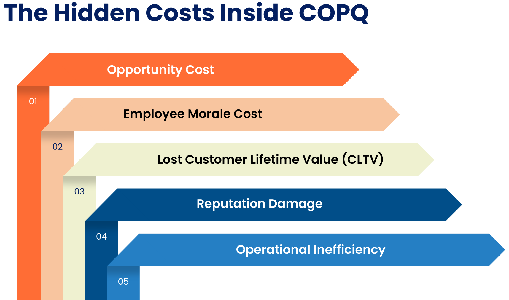 • COPQ factors that aren’t obvious, like lost time on new ideas, lower customer lifetime value, and employee burnout, are often more expensive than the costs that are easy to see.